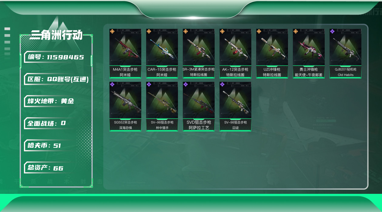 [11598465]总资产:66.1M 6传说枪械 哈夫币:51.320K 可二次 可修改实名 烽火地带段位:黄金 全面战场段位:无段位 传说武器皮肤:UZI冲锋枪-特斯拉线圈,AK-12突击步枪-特斯拉线圈,SR-3M紧凑突击步枪-特斯拉线圈,勇士冲锋枪-能天使-午夜邮差,M4A1突击步枪-阿米娅,CAR-15突击步枪-阿米娅 史诗武器皮肤:SG552突击步枪-深海恐惧,QJB201轻机枪-Old Habits,SV-98狙击步枪-林中猎手,SV-98狙击步枪-囚徒,SVD狙击步枪-阿萨拉工艺