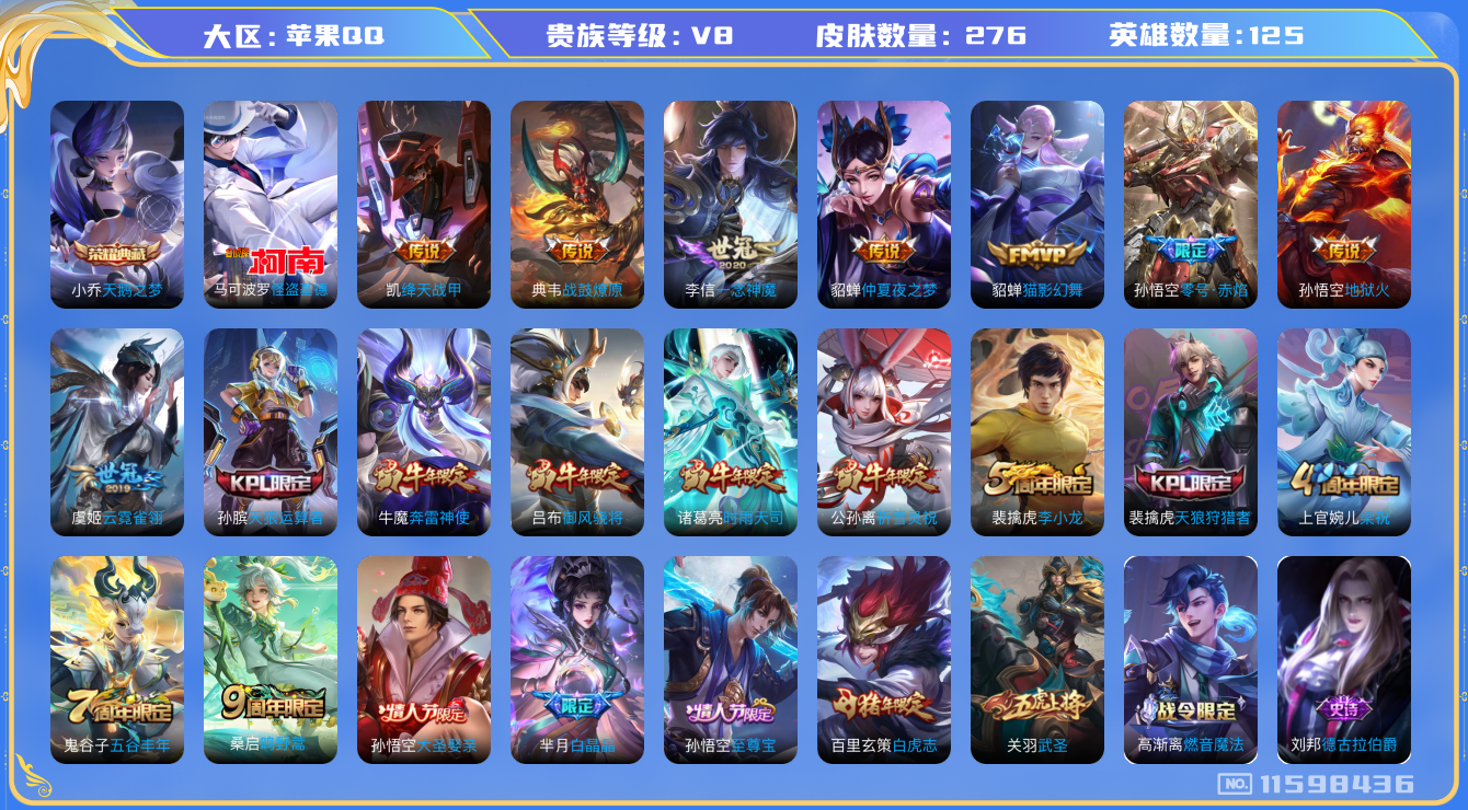 [11598436]V8 1典藏 1珍品传说 14传说 125英雄 276皮肤 可修改实名 女号 优质装备:天鹅之梦(小乔典藏),怪盗基德,绛天战甲(鸡嘴战神),猫影幻舞,一念神魔,云霓雀翎,地狱火,仲夏夜之梦(大飞蛾),零号·赤焰 传说皮:典韦战鼓燎原 珍宝阁皮:妄想食味,优雅恋人,蔷薇恋人 限定皮:鸣野蒿,至尊宝,白虎志(电光耗子),白晶晶,时雨天司(水龙头),五谷丰年,武圣,天狼运算者,梁祝,御风骁将(吕布年限),天狼狩猎者,奔雷神使(牛魔年限),祈雪灵祝(雪兔子),李小龙,大圣娶亲 史诗皮:星界战将,怒海争锋,蒙犽顽岩魄,琥珀纪元伽罗,百相守梦-百里守约,紫霞仙子,电玩小子(小书包),黄金分割率,特工魅影,千年之狐,江河有灵,高渐离燃音魔法,蒙恬荣光圣徽,冰冠公主,偶像歌手,末日机甲-吕布,猫狗日记-孙策,时之恋人-孙尚香,乱世虎臣,节奏热浪,修罗,女仆咖啡,摇滚巨星,水果甜心,天才门将,星夜王子,心灵骇客,功夫厨神,德古拉伯爵,暗隐猎兽者,幽灵船长,鬼剑武藏,心灵战警,纤云弄巧,繁星吟游(呼啦呼啦),拒霜思,乘风破浪,逐浪之夏,月团寄思,水晶猎龙者,金属风暴,原初追逐者,圣诞狂欢,圣诞恋歌,鹰眼统帅,暗夜贵公子,魅力维加斯