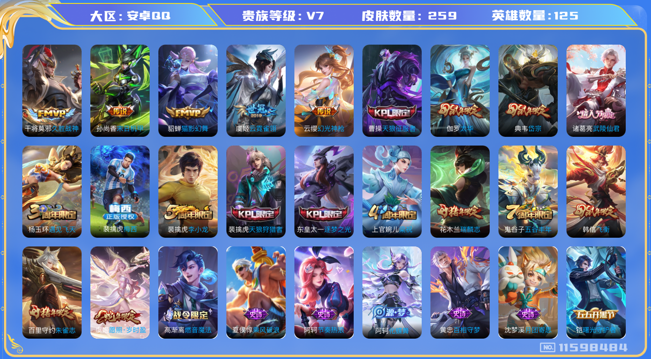 [11598484]V7 8传说 125英雄 259皮肤 可修改实名 优质装备:猫影幻舞,久胜战神,云霓雀翎,末日机甲-孙尚香(绿蚂蚱) 传说皮:幻光神枪 珍宝阁皮:蔷薇恋人,玩趣恶龙 限定皮:愿照·岁时盈(虞姬年限),太华(伽罗年限),梅西,武陵仙君(小桃花),飞衡(韩信年限),瑞麟志(木兰年限),遇见飞天,五谷丰年,梁祝,天狼狩猎者,岱宗(典韦年限),天狼征服者,李小龙,逐梦之光,朱雀志(守约年限) 史诗皮:化蝶舞,百相守梦-黄忠,白龙吟,黄金分割率,特工魅影,高渐离燃音魔法,猫狗日记-孙策,乱世虎臣,节奏热浪,女仆咖啡,摇滚巨星,水果甜心,星夜王子,暗隐猎兽者,鬼剑武藏,地狱岩魂,纤云弄巧,乘风破浪,逐浪之夏,月团寄思,水晶猎龙者,曙光守护者,金属风暴,圣诞狂欢,圣诞恋歌,鹰眼统帅,无心