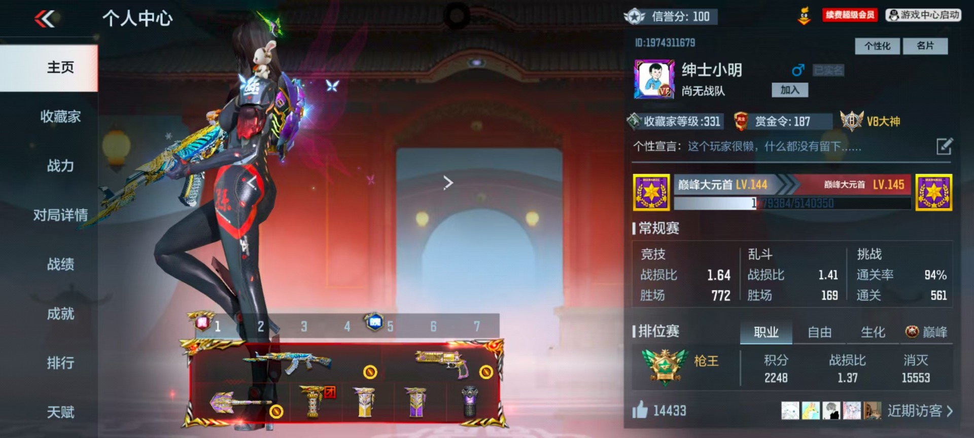 [11598612]可二次 可修改实名 V8 19王者武器 280英雄武器 11英雄角色 623万化 枪王 武器:王者之心,王者之烈,王者之蝶,AWM-妙才,激昂霸王枪,KSG-孟获,CZ75-策,王者之魂,王者之电,王者之轮,王者之击,王者之啸,COP 357-雷神,AK47-黑武士觉醒,AK47-火麒麟,AK47-游骑兵,巴雷特-毁灭,巴雷特-极光,AK47-天使,AK47-竞技战魂,AK47-机械迷城,AK47-火麒麟-灵狐,AK47-变色龙,AK47-燎天净火,AK47-木兰,M4A1-机械迷城,M4A1-竞界荣光,AWM-天使,AWM-游骑兵,QBZ95-天使,QBZ03-死神,QBZ03-金色蔷薇,MK5-机械纪元,M12S-雷霆,双持斯泰尔-天使,KSG-黑骑士,贝雷塔-力拔山河,COP 357-旗袍,AK47-沙漠领主,AK47-冰魂觉醒,AK47-牡丹精灵,AK47-樱斗士-超觉,AK47-英朗,AK47-猩红传说,AK47-血武士,AK47-沙漠郡主-二觉,M4A1-破空冰刃,M4A1-心动次元觉醒,M4A1-猎神,M4A1-赛博雷神,M4A1-运输船,AWM-天龙,SCAR-幽暗骑士,M4A1-夏清,QBZ03-湮灭,M14EBR-暗夜,AK12-天启,MK47-鼓龙