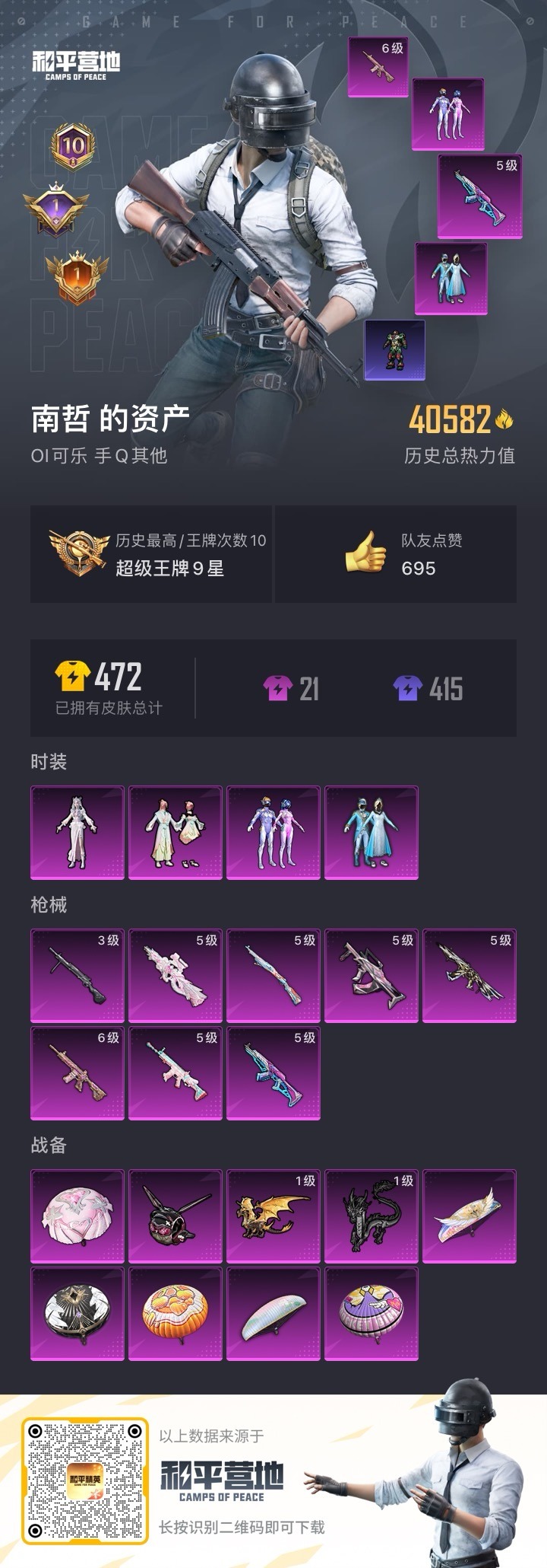 - PX_2100689-??/枪械6/装备204/载具1/战备137/王牌印记5/热力值60432/五级AKM-绿萝繁花/五级SCAR-L-锦绣绵绵/七级M416-五爪金龙/五级Kar98K-巳巳如意/五级Mk14-甜梦熊击/七级破片手榴弹-美味星星糖/晶梦灵驹/梦幻火箭/角色-千金淑猫/角色-晶梦幻蝶/角色-冷漠罗丽/套装-龟仙人/玩偶服-酷勇熊大/玩偶服-憨乐熊二/套装-绒宝小鹅/套装-巳巳如意
