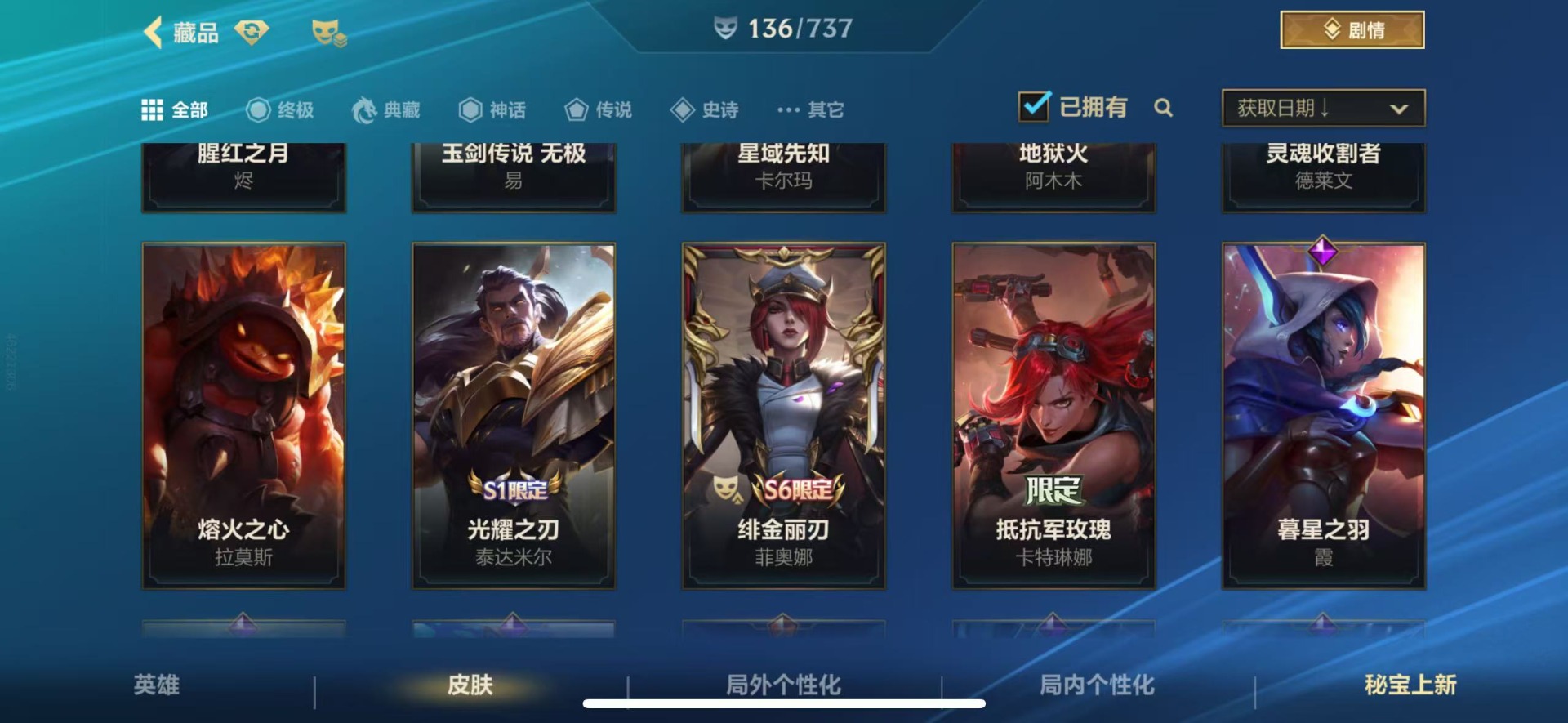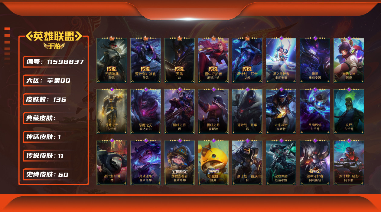 [11598837]可二次 可修改实名 1神话 11传说 60史诗 136皮肤 114英雄 铂金 皮肤:奥莉安娜-光耀之心,奥莉安娜-星之守护者,奥莉安娜-哥特女仆,奥莉安娜-暗星,阿狸-电玩女神,阿狸-焰尾妖狐,阿狸-偶像歌手,薇恩-光明哨兵,薇恩-源计划:净化,薇恩-苍穹之光,泰达米尔-关羽 云长,泰达米尔-光耀之刃,泰达米尔-恶魔之刃,烬-龙冕异士,烬-腥红之月,烬-源计划:升华,崔斯特-王牌舰长,崔斯特-未来战士,崔斯特-腥红之月,布兰德-灵魂烈焰,布兰德-苍穹之光,布兰德-丧尸,劫-天煞,劫-冲击之刃,劫-源计划:阴,崔丝塔娜-灵魂莲华,崔丝塔娜-娜就去看看,崔丝塔娜-游击队员,提莫-小蜜蜂,提莫-熊猫,提莫-兔宝宝,蔚-双城之战,蔚-女警官,蔚-源计划:裁决,厄运小姐-破败军团,厄运小姐-福牛守护者,厄运小姐-西部牛仔,艾希-王牌司令,艾希-极地女神,艾希-源计划:联合,阿利斯塔-福牛守护者,阿利斯塔-黑暗骑士,阿利斯塔-哞利斯塔,阿卡丽-银色之牙,阿卡丽-源计划:暗影,墨菲特-黑曜石守护者,墨菲特-霸天巨兽,盖伦-海上霸主,盖伦-钢铁军团