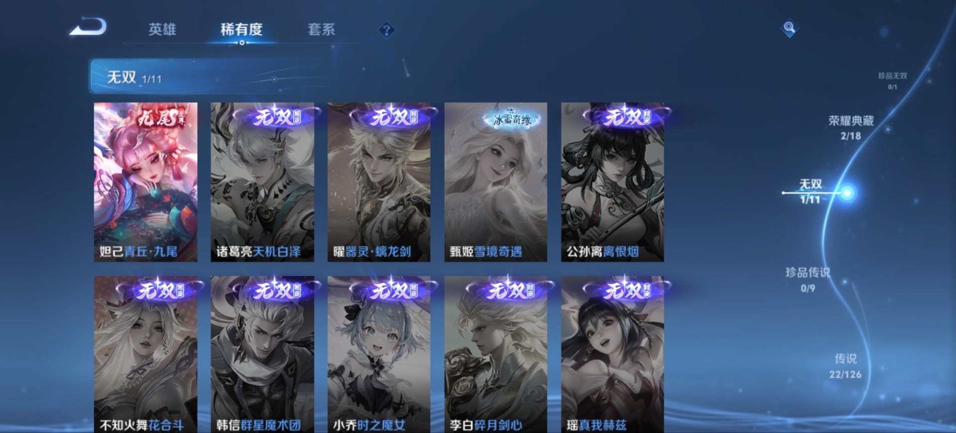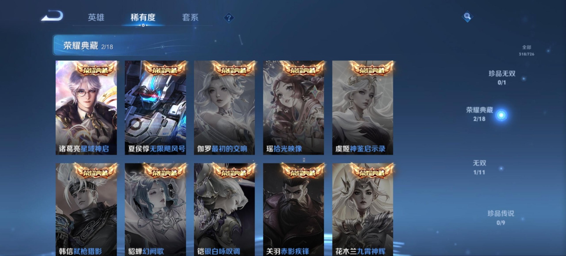 大乔白鹤梁神女,伽罗天狼溯光者,苏烈玄武志,干将莫邪冰霜恋舞曲,孙尚香异界灵契,诸葛亮时雨天司,公孙离蜜橘之夏,裴擒虎李小龙,上官婉儿梁祝,上官婉儿天狼绘梦者,花木兰青春决赛季,马可波罗逐梦之星,桑启鸣野蒿,孙悟空孙行者,孙悟空至尊宝,芈月白晶晶,百里玄策白虎志,马超神威,妲己时之彼端,韩信逐梦之影,百里守约朱雀志,蔡文姬奇迹圣诞,嫦娥如梦令,王昭君凤凰于飞,关羽冰锋战神