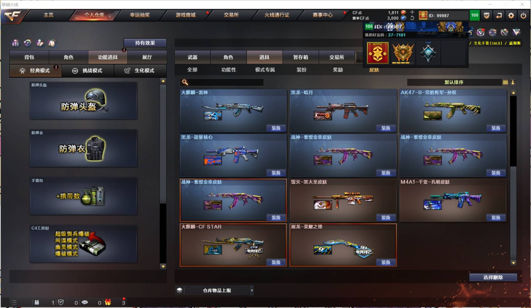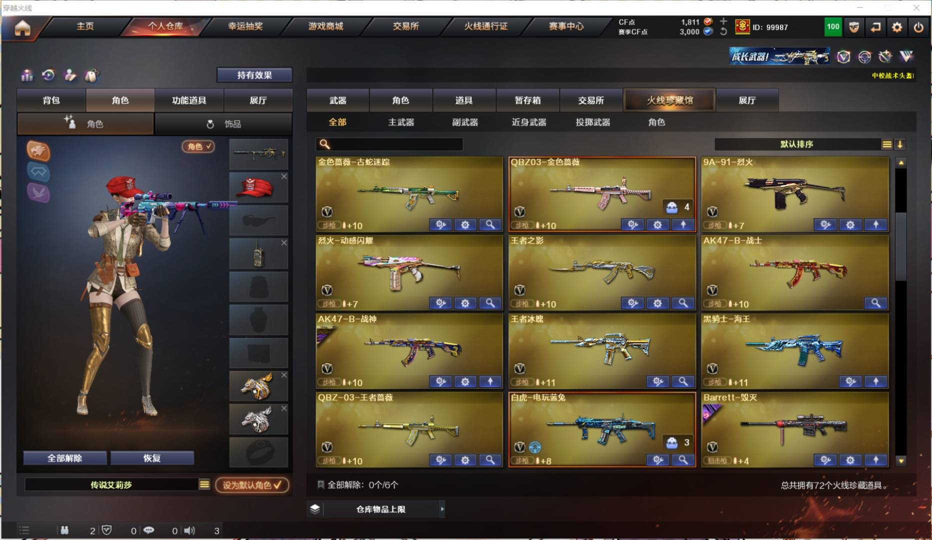[11598987]1传说角色 1炫金武器 62V武器 可二次 可修改实名 优质装备:M200-幻神,M200-竞技荣光,QBZ03-金色蔷薇,白虎-电玩蓝兔,AK47-火麒麟,M4A1-雷神,M4A1-武圣,Barrett-毁灭,AWM-裁决,AK12-天启,9A91-烈火,屠龙,柯尔特-竞技荣光,擎天-竞技荣光,Barrett-暗月传说,斩神刀-雷暴,烈火-动感闪耀,天神-动感闪耀,屠龙-动感闪耀,擎天-云海游龙,AK47-黑武士-锦绣游龙,Glock18-武圣,烈龙-云海游龙,无影-神兵利器,金色蔷薇-古蛇迷踪,修罗-古蛇迷踪 V武器:AK47-B-战士,AK47-B-战神,黑骑士-海王 王者武器:王者冰魄-觉醒版,QBZ-03-王者蔷薇-觉醒版,王者之影-觉醒版,王者之锋-觉醒版,COP 357-雷霆王者-觉醒版,王者之力-觉醒版,王者星神-觉醒版 炫金武器:炫金修罗 热门武器:裁决-雪莉杨