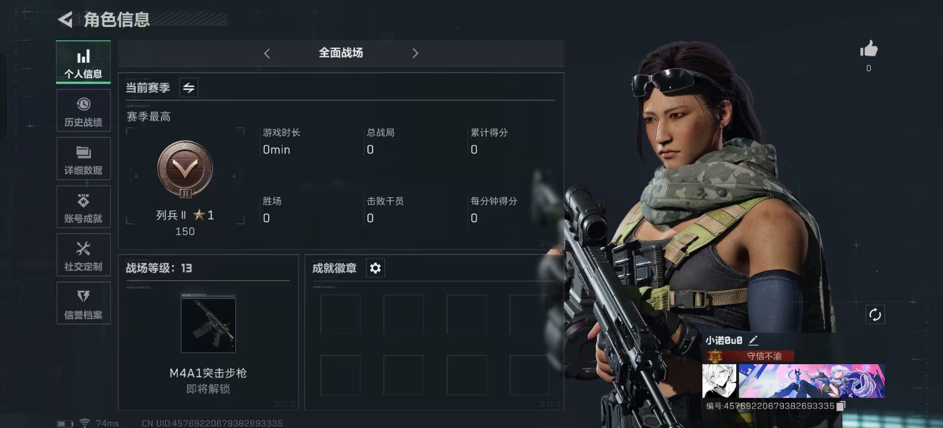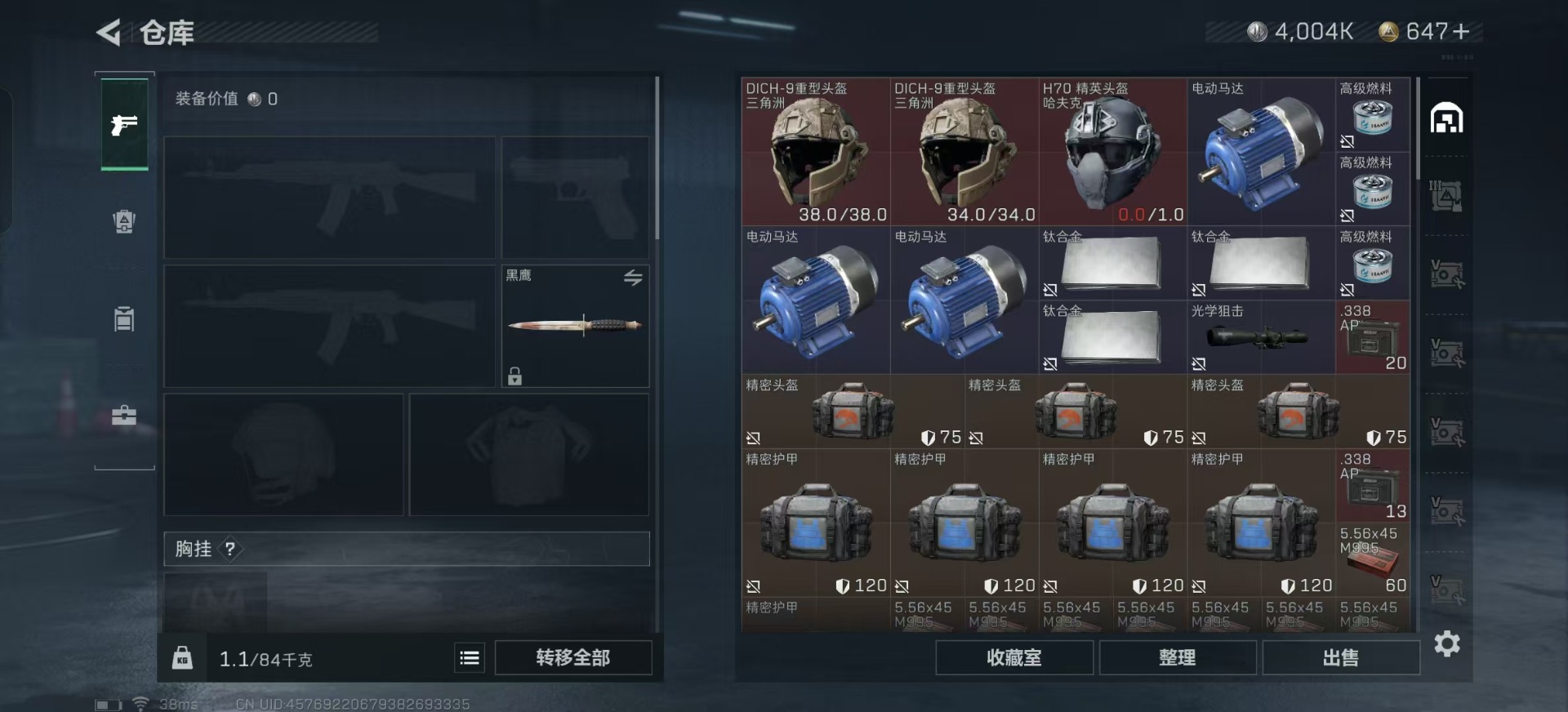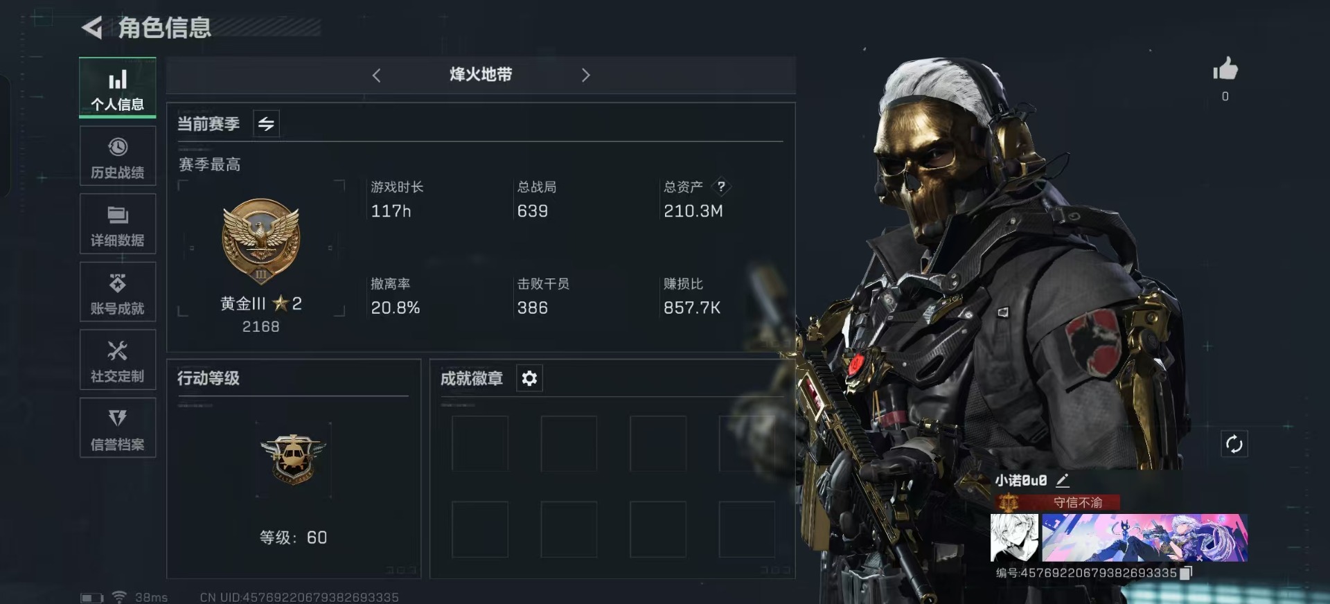 - [11687785]总资产:49.6M 5干员外观 2近战传说 26传说枪械 哈夫币:3.732K 高级安全箱(9.17到期) 可二次 可修改实名 优质装备:近战-影锋,近战-北极星,K416突击步枪-命运(典藏),QBZ95-1突击步枪-王牌之剑(典藏) 烽火地带段位:钻石 全面战场段位:上等兵 传说武器皮肤:QJB201轻机枪-风林火山,SR-25射手步枪-水墨云图,SCAR-H战斗步枪-水墨云图,M1014霰弹枪-影锋,AWM狙击步枪-影锋,SCAR-H战斗步枪-铁艺苍穹,AK-12突击步枪-夜鹰,G18-飞虎,M16A4突击步枪-狩猎时刻,M4A1突击步枪-阿米娅,CAR-15突击步枪-阿米娅,复合弓-黑-天际线,Vector冲锋枪-狩猎时刻,G3战斗步枪-狩猎时刻,QCQ171冲锋枪-北极星,勇士冲锋枪-能天使-午夜邮差,725双管霰弹枪-送葬人-无题密令,K437突击步枪-北极星,M4A1突击步枪-蚀金玫瑰,QBZ95-1突击步枪-破军,CAR-15突击步枪-黑鹰坠落,Vector冲锋枪-能天使-午夜邮差 史诗武器皮肤:K416突击步枪-暗鸦,SR-3M紧凑突击步枪-英雄,QBZ95-1突击步枪-ACE,M4A1突击步枪-特勤执行,AUG突击步枪-特勤执行,Vector冲锋枪-红色彗星,PTR-32战斗步枪-ACE,PKM通用机枪-蝮蛇,G3战斗步枪-战场英杰,M16A4突击步枪-竞赛选手,AS Val突击步枪-尖端治疗,SG552突击步枪-尖端治疗,PKM通用机枪-荒野求生,MP5冲锋枪-深海恐惧,勇士冲锋枪-深海恐惧,SG552突击步枪-深海恐惧,AKM突击步枪-林中猎手,M1014霰弹枪-林中猎手,PTR-32突击步枪-英雄,AS Val突击步枪-典狱官,M250通用机枪-囚徒,SCAR-H战斗步枪-囚徒,MP7冲锋枪-无垢,QBZ95-1突击步枪-曙光,SCAR-H战斗步枪-国风,S12K霰弹枪-曙光,PKM通用机枪-英雄,PKM通用机枪-魔药,AUG突击步枪-战术迷彩 干员外观:威龙-铁面判官,红狼-蚀金玫瑰,骇爪-水墨云图,威龙-飞虎,露娜-黑·天际线