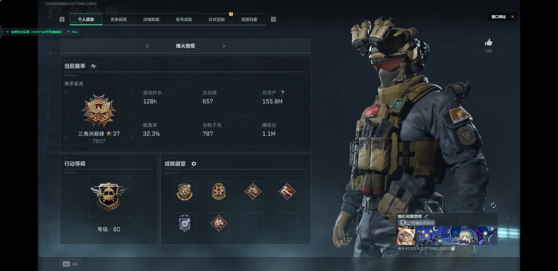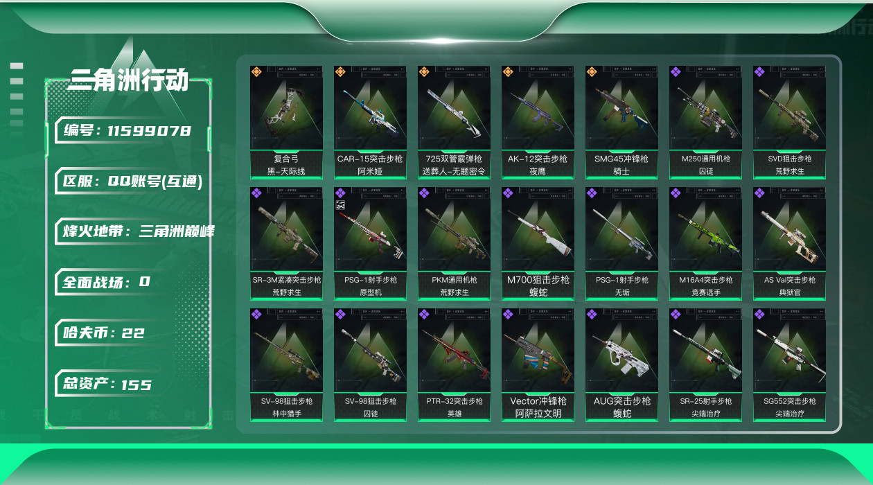 [11599078]可二次 可修改实名 实名:可修改 高级安全箱(2×3)9.15号到期 烽火地带段位:三角洲巅峰 全面战场段位:无段位 总资产:155.8 哈夫币:22.586 传说武器皮肤:AK-12突击步枪-夜鹰,SMG45冲锋枪-骑士,复合弓-黑-天际线,CAR-15突击步枪-阿米娅,725双管霰弹枪-送葬人-无题密令 史诗武器皮肤:PSG-1射手步枪-原型机(典藏),AUG突击步枪-蝮蛇,M700狙击步枪-蝮蛇,G3战斗步枪-战场英杰,SR-25射手步枪-尖端治疗,PKM通用机枪-荒野求生,AS Val突击步枪-尖端治疗,M700狙击步枪-守夜人,SG552突击步枪-尖端治疗,Ash-12战斗步枪-守夜人,SR-3M紧凑突击步枪-荒野求生,勇士冲锋枪-深海恐惧,SG552突击步枪-深海恐惧,AKM突击步枪-林中猎手,M16A4突击步枪-竞赛选手,PKM通用机枪-守夜人,SVD狙击步枪-荒野求生,M1014霰弹枪-林中猎手,SR-3M紧凑突击步枪-纷争,SV-98狙击步枪-林中猎手,PTR-32突击步枪-英雄,PSG-1射手步枪-无垢,AS Val突击步枪-典狱官,M250通用机枪-囚徒,SV-98狙击步枪-囚徒,Vector冲锋枪-阿萨拉文明,SVD狙击步枪-阿萨拉工艺,PKM通用机枪-英雄