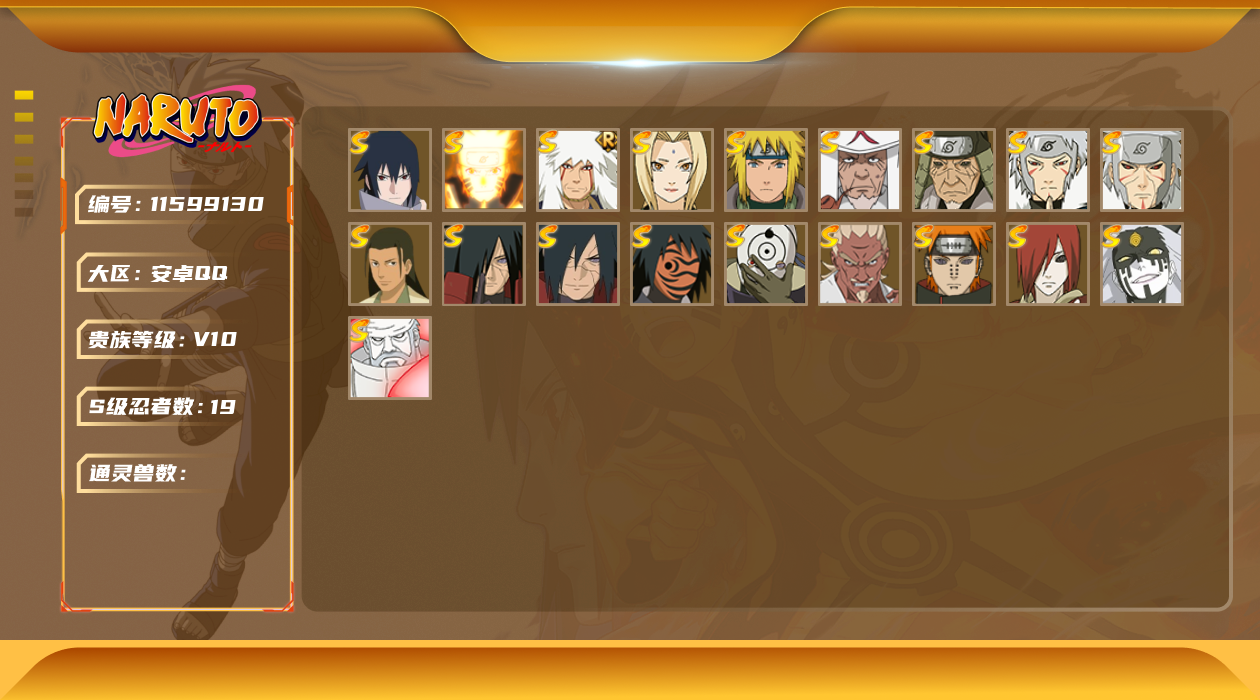 [11599130]V10 19S忍 22A忍 1170.2W战力 可二次 可修改实名 S级忍者:艾「忍界大战」,大筒木桃式,宇智波斑「秽土转生·解」,千手柱间·木叶创立,宇智波佐助「永恒万花筒」,神秘面具男 「红夜之刃」,大筒木金式「博人传」,漩涡鸣人 「九喇嘛连结」,自来也 「舞之豪杰」,宇智波斑「秽土转生」,“宇智波斑” 「白面具」,千手扉间「秽土转生」,猿飞日斩「秽土转生」,长门「秽土转生」,千手扉间,佩恩「天道」,猿飞日斩,波风水门,纲手