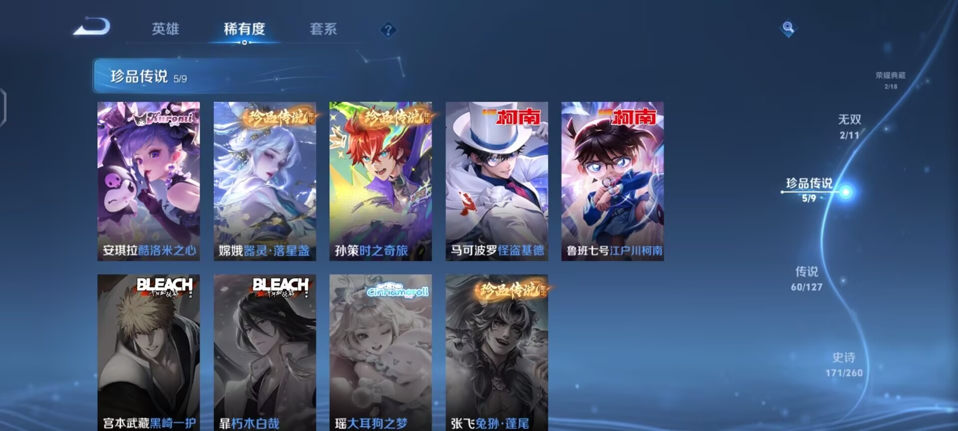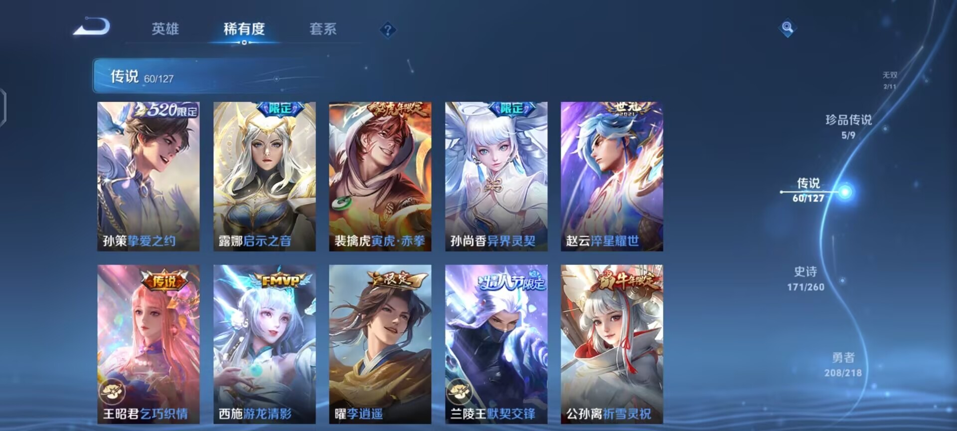 夏侯惇匿光决锋者,夏侯惇霜北刀,黄忠烈魂,老夫子圣诞老人,盾山梦圆繁星,孙尚香异界灵契,牛魔奔雷神使,露娜启示之音,露娜一生所爱,诸葛亮时雨天司,司空震愿照·山河定,裴擒虎李小龙,裴擒虎天狼狩猎者,裴擒虎寅虎·赤拳,上官婉儿梁祝,花木兰默契交锋,马可波罗山海·玄木吟,猪八戒猪悟能,芈月白晶晶,孙悟空至尊宝,雅典娜神奇女侠,韩信飞衡,澜愿照·九州拓,虞姬霸王别姬,虞姬愿照·岁时盈,王昭君映山客,大乔白鹤梁神女,铠青龙志,伽罗天狼溯光者,伽罗太华,孙膑天狼运算者,吕布御风骁将,后羿如梦令,兰陵王默契交锋,公孙离祈雪灵祝,李白诗剑行,艾琳陌上桑,桑启鸣野蒿,女娲愿照·千秋盛,百里玄策白虎志,赵云引擎之心,盘古冰霜神祇,妲己愿照·众生和,蔡文姬愿照·福禄聚,关羽武圣,关羽冰锋战神