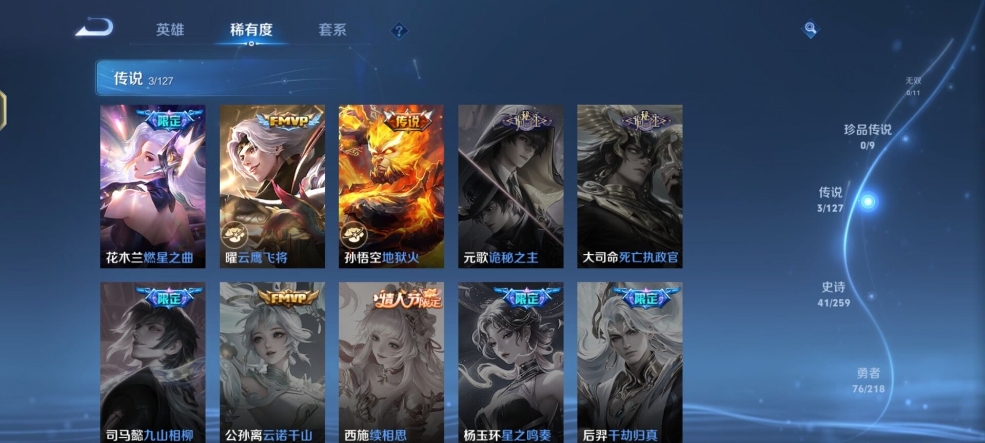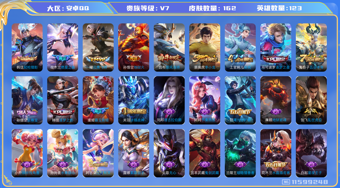 [11599248]V7 1典藏 3传说 123英雄 162皮肤 可修改实名 优质装备:弑枪猎影(韩信典藏),云鹰飞将(小将军),地狱火,燃星之曲 珍宝阁皮:女武神 限定皮:至尊宝,五谷丰年,冰锋战神,梁祝,御风骁将(吕布年限),逐梦之星,李小龙,逐梦之影,霸王别姬-虞姬 史诗皮:紫霞仙子,白龙吟,江河有灵,偶像歌手,乱世虎臣,节奏热浪,修罗,水果甜心,星夜王子,德古拉伯爵,暗隐猎兽者,鬼剑武藏,舞动绿茵,地狱岩魂,纤云弄巧,缤纷独角兽,水晶猎龙者,曙光守护者,热力回旋,鹰眼统帅,魅力维加斯,黎明之约,无心