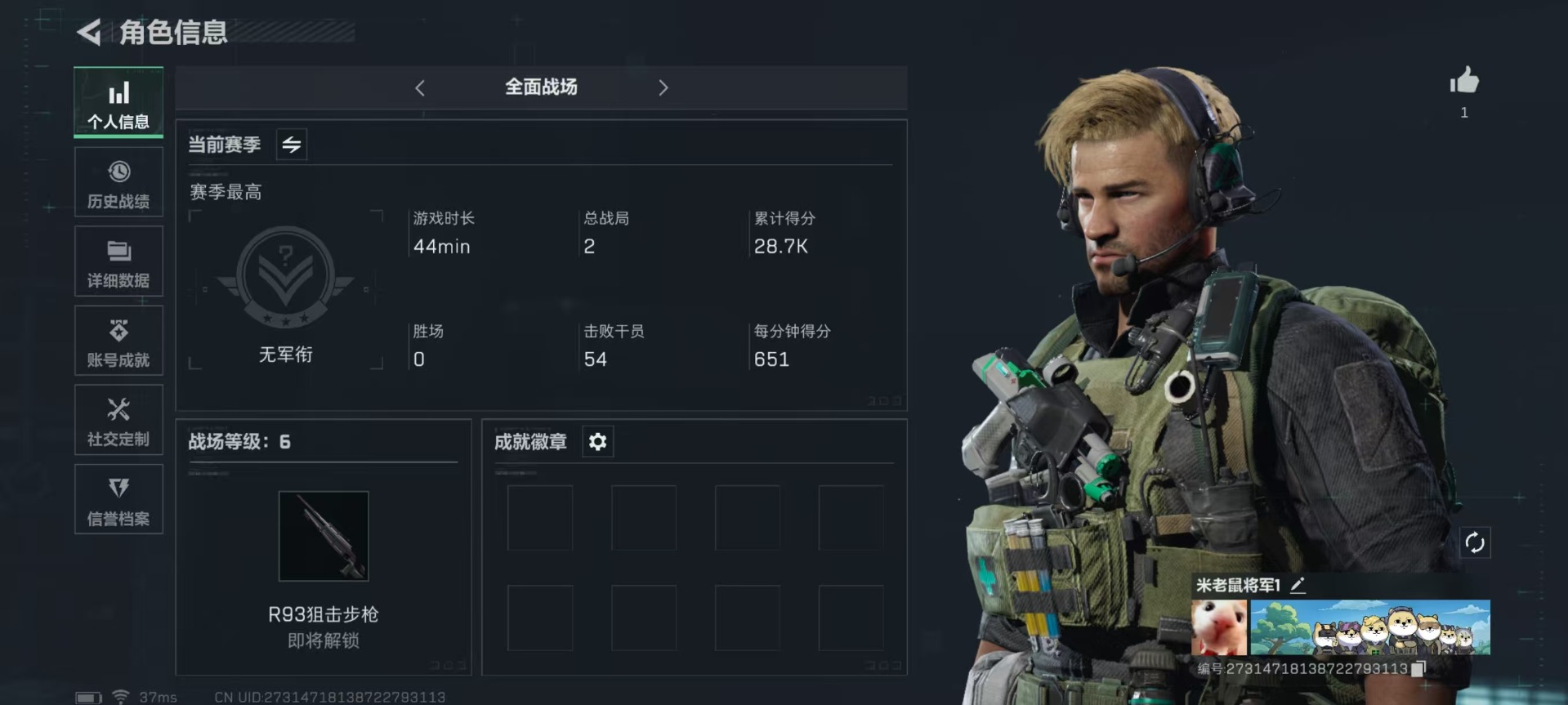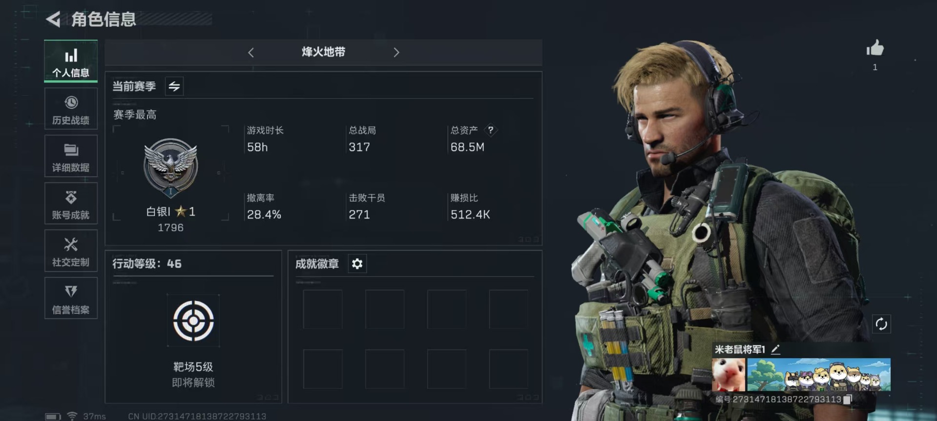 [11599286]总资产:68.5M 10传说枪械 哈夫币:4.350K 进阶安全箱(2×2)9.15号到期 可二次 可修改实名 烽火地带段位:白银 全面战场段位:无段位 传说武器皮肤:UZI冲锋枪-特斯拉线圈,AWM狙击步枪-捞点薯条,腾龙突击步枪-捞点薯条,93R-捞点薯条,AK-12突击步枪-特斯拉线圈,SR-3M紧凑突击步枪-特斯拉线圈,勇士冲锋枪-能天使-午夜邮差,复合弓-黑-天际线,M4A1突击步枪-阿米娅,CAR-15突击步枪-阿米娅 史诗武器皮肤:QJB201轻机枪-Old Habits,SV-98狙击步枪-林中猎手,M250通用机枪-囚徒,SV-98狙击步枪-囚徒