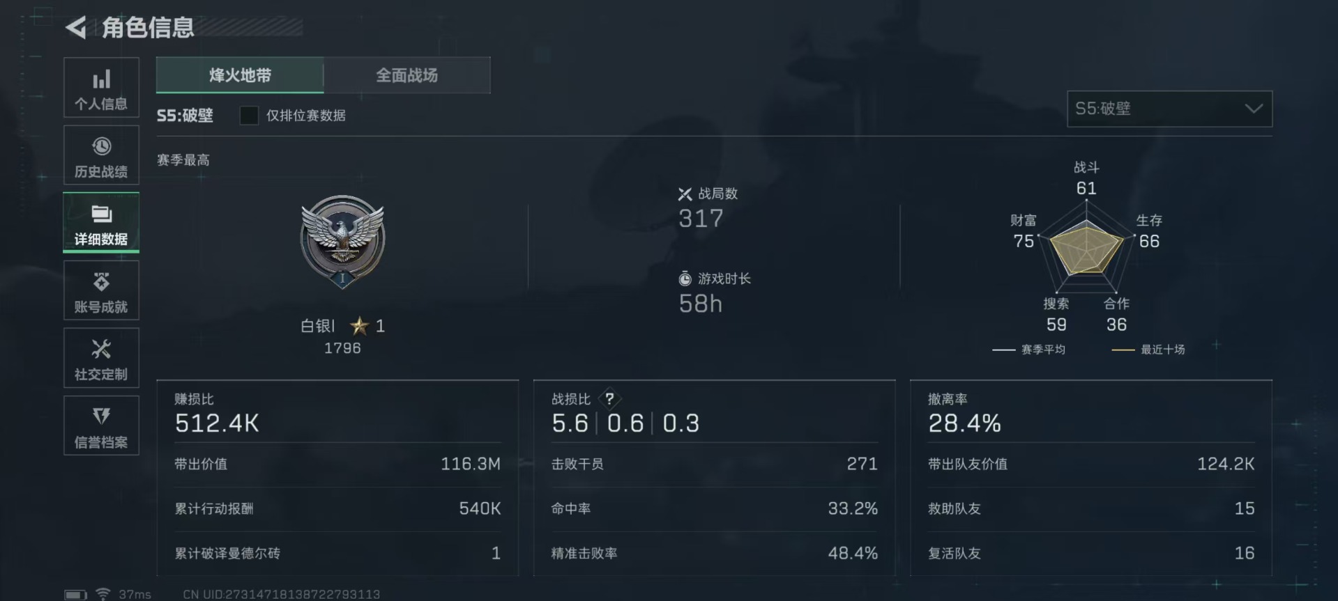 - [11527271]总资产:104.9M 1干员外观 1近战传说 25传说枪械 哈夫币:10.956K 高级安全箱(2×3)9.15号到期 可二次 可修改实名 优质装备:近战-影锋,M4A1突击步枪-棱镜攻势(典藏) 烽火地带段位:钻石 全面战场段位:军士长 传说武器皮肤:SR-25射手步枪-水墨云图,M1014霰弹枪-影锋,AWM狙击步枪-影锋,SCAR-H战斗步枪-铁艺苍穹,AK-12突击步枪-夜鹰,G18-飞虎,SMG45冲锋枪-骑士,M4A1突击步枪-阿米娅,CAR-15突击步枪-阿米娅,AWM狙击步枪-捞点薯条,腾龙突击步枪-捞点薯条,93R-捞点薯条,AK-12突击步枪-特斯拉线圈,SR-3M紧凑突击步枪-特斯拉线圈,UZI冲锋枪-特斯拉线圈,勇士冲锋枪-能天使-午夜邮差,725双管霰弹枪-送葬人-无题密令,M7战斗步枪-维京,M4A1突击步枪-蚀金玫瑰,AKM突击步枪-赤枭,QBZ95-1突击步枪-破军,CAR-15突击步枪-黑鹰坠落,Vector冲锋枪-能天使-午夜邮差 史诗武器皮肤:PKM通用机枪-荒野求生,SR-3M紧凑突击步枪-荒野求生,SVD狙击步枪-荒野求生,M250通用机枪-囚徒,SV-98狙击步枪-囚徒,SCAR-H战斗步枪-囚徒,腾龙突击步枪-无垢,MP7冲锋枪-无垢 干员外观:红狼-蚀金玫瑰