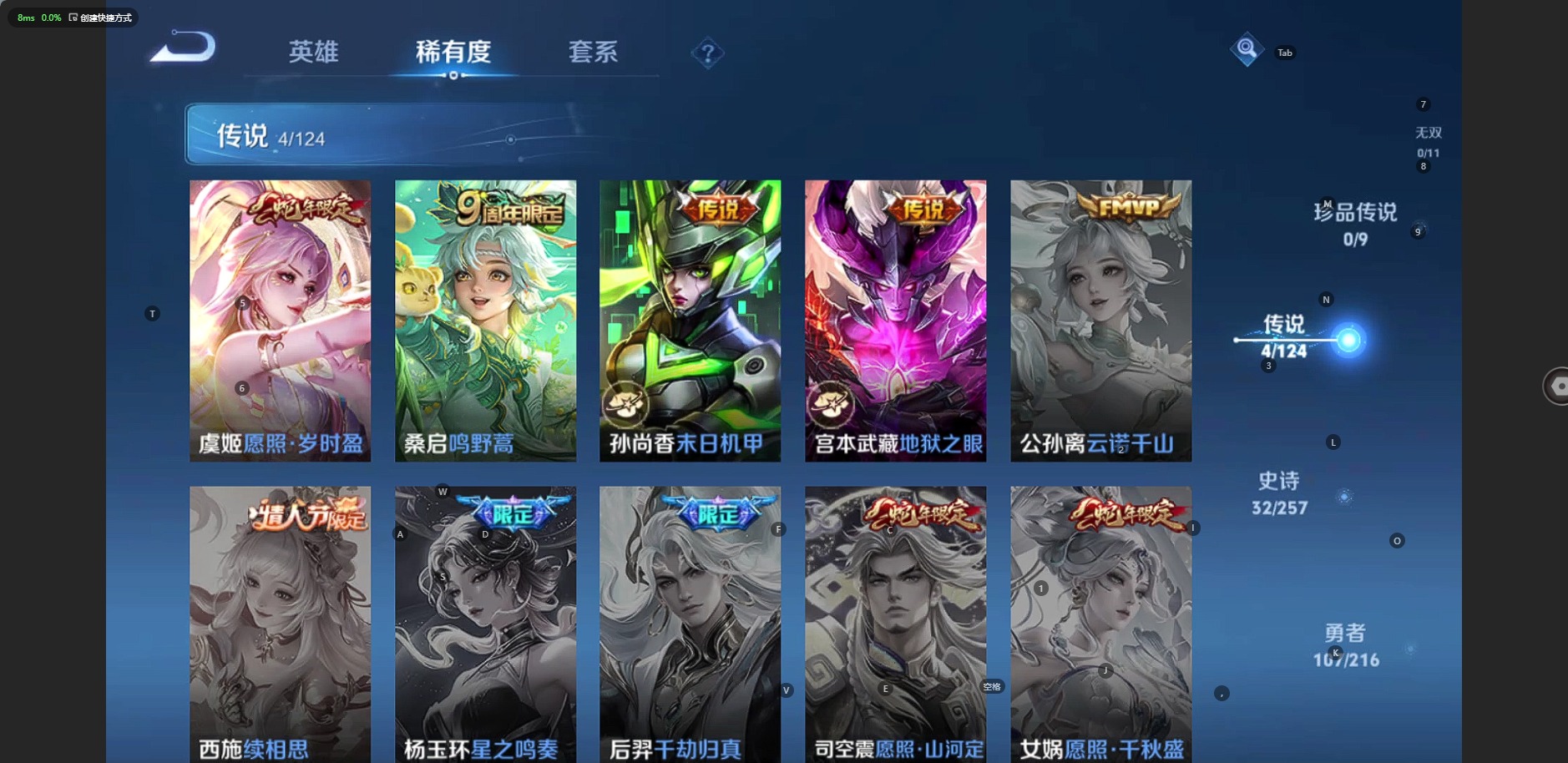 - [11608937]V7 1典藏 7传说 125英雄 291皮肤 可修改实名 优质装备:神鉴启示录,炽阳神光,浮生妄,霜月吟,澜逐花归海 传说皮:落雪白狼 珍宝阁皮:妄想食味,优雅恋人,蔷薇恋人 限定皮:愿照·千秋盛(女娲年限),陌上桑,鸣野蒿,至尊宝,傲雪梅枪,遇见飞天,五谷丰年,龙胆,李小龙,猪悟能,引擎之心,美猴王 史诗皮:器灵·浮梦炉,星界战将,撼地雄心,破空之剑,战舞者,东方月初,埋骨钱,芈月浮光幕影,决胜骁骑,蔬乡物语(鲁班七号),百相守梦-百里守约,百相守梦-黄忠,特工魅影,千年之狐,江河有灵,匿光侦查者,鹤归松栖(赵怀真),雪夜绮愿(周瑜),真我赫兹(镜),百解令(蒙犽),高渐离燃音魔法,蒙恬荣光圣徽,匿光破解者,偶像歌手,暗夜猫娘,末日机甲-吕布,猫狗日记-孙策,节奏热浪,修罗,女仆咖啡,摇滚巨星,水果甜心,天才门将,星夜王子,心灵骇客,德古拉伯爵,暗隐猎兽者,鬼剑武藏,天秀·启明,纤云弄巧,拒霜思,缤纷独角兽,乘风破浪,逐浪之夏,月团寄思,水晶猎龙者,金属风暴,原初追逐者,圣诞狂欢,鹰眼统帅,魅力维加斯,赏金猎手,无心,未来纪元-赵云
