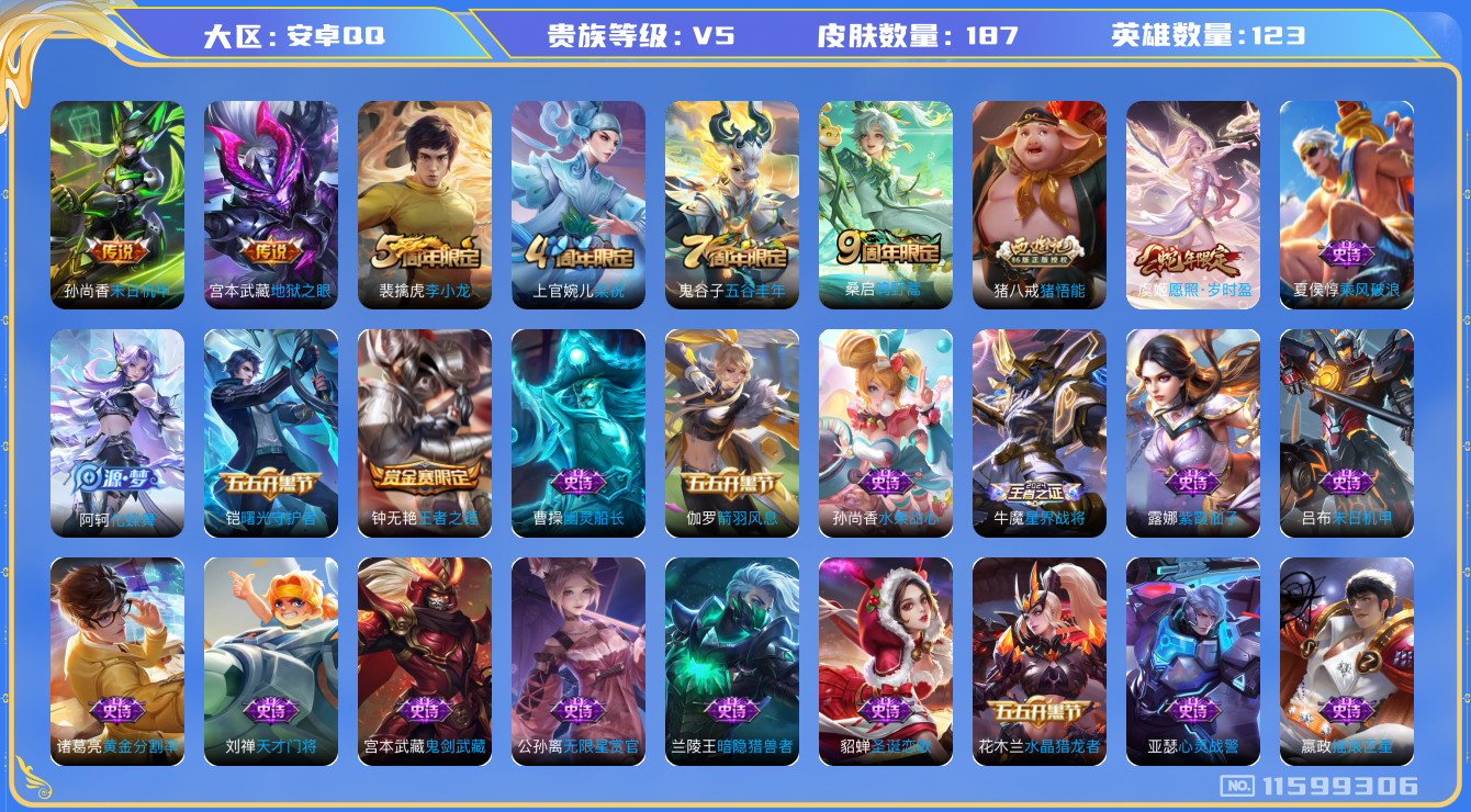 [11599306]V5 4传说 123英雄 187皮肤 可修改实名 传说皮:地狱之眼,末日机甲-孙尚香(绿蚂蚱) 珍宝阁皮:胡桃夹子,女武神,玩趣恶龙 限定皮:愿照·岁时盈(虞姬年限),鸣野蒿,五谷丰年,梁祝,李小龙,猪悟能 史诗皮:星界战将,化蝶舞,紫霞仙子,黄金分割率,特工魅影,无限星赏官,末日机甲-吕布,摇滚巨星,水果甜心,天才门将,功夫厨神,暗隐猎兽者,幽灵船长,鬼剑武藏,心灵战警,乘风破浪,逐浪之夏,水晶猎龙者,曙光守护者,箭羽风息,金属风暴,原初追逐者,圣诞恋歌,鹰眼统帅,王者之锤,未来纪元-赵云