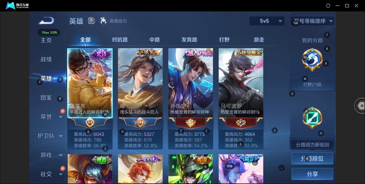 - [10581350]V5 3传说 124英雄 136皮肤 可修改实名 传说皮:冠军飞将,胖达荣荣 珍宝阁皮:胡桃夹子,优雅恋人 限定皮:鸣野蒿,五谷丰年 史诗皮:星界战将,龙之律动,百相守梦-黄忠,埋骨钱,百相守梦-周瑜,特工魅影,千年之狐,江河有灵,蒙恬荣光圣徽,冰冠公主,偶像歌手,末日机甲-吕布,节奏热浪,摇滚巨星,水果甜心,天才门将,暗隐猎兽者,鬼剑武藏,地狱岩魂,乘风破浪,逐浪之夏,月团寄思,水晶猎龙者,箭羽风息,金属风暴,原初追逐者,圣诞狂欢,鹰眼统帅,魅力维加斯,黎明之约,未来纪元-赵云