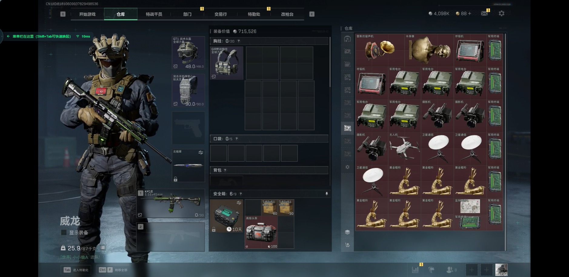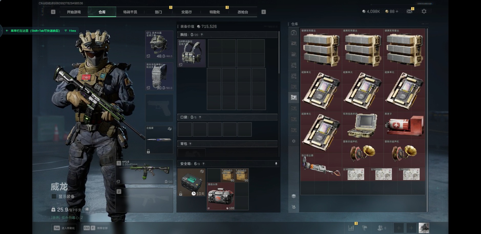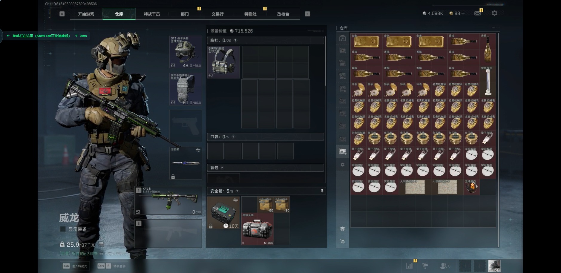 [11599408]总资产:258.2M 1近战传说 17传说枪械 哈夫币:4.098K 顶级安全箱(3×3)9.15号到期 可二次 可修改实名 优质装备:近战-北极星,顶级安全箱(3x3) 烽火地带段位:钻石 全面战场段位:列兵 传说武器皮肤:SMG45冲锋枪-骑士,UZI冲锋枪-特斯拉线圈,AWM狙击步枪-捞点薯条,腾龙突击步枪-捞点薯条,93R-捞点薯条,AK-12突击步枪-特斯拉线圈,SR-3M紧凑突击步枪-特斯拉线圈,勇士冲锋枪-能天使-午夜邮差,复合弓-黑-天际线,K437突击步枪-北极星,QCQ171冲锋枪-北极星,725双管霰弹枪-送葬人-无题密令,M4A1突击步枪-阿米娅,CAR-15突击步枪-阿米娅,AK-12突击步枪-夜鹰,CAR-15突击步枪-黑鹰坠落 史诗武器皮肤:MP7冲锋枪-原型机(典藏),PKM通用机枪-蝮蛇,SG552突击步枪-尖端治疗,M1014霰弹枪-林中猎手,PKM通用机枪-守夜人,AS Val突击步枪-尖端治疗,M700狙击步枪-守夜人,Ash-12战斗步枪-守夜人,SR-25射手步枪-尖端治疗,MP5冲锋枪-深海恐惧,SG552突击步枪-深海恐惧,AKM突击步枪-林中猎手,.357左轮-幸运时刻,PTR-32突击步枪-Old Habits,M16A4突击步枪-竞赛选手,SV-98狙击步枪-林中猎手,PTR-32突击步枪-英雄,SCAR-H战斗步枪-囚徒,腾龙突击步枪-无垢,MP7冲锋枪-无垢,PSG-1射手步枪-无垢,SVD狙击步枪-荒野求生,SR-3M紧凑突击步枪-荒野求生,PKM通用机枪-荒野求生,Vector冲锋枪-阿萨拉文明,P90冲锋枪-紧急戒备