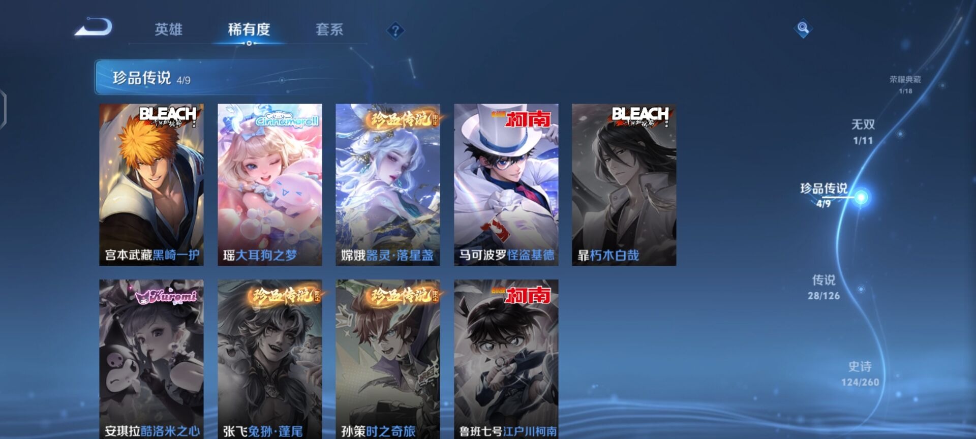 - [12293463]V8 1典藏 20传说 125英雄 239皮肤 可修改实名 优质装备:拾光映像(瑶典藏),云鹰飞将(小将军),一念神魔,音你心动-周瑜,时之恋人-刘备(电焊工),淬星耀世,无双飞将,山海·炽霜斩(李信年限),山海·苍雷引(电光曜子),电玩·雷克斯,鹤归松栖(云缨),澜逐花归海,涂山容容 传说皮:乘龙·问璇玑(孙尚香年限),乘龙·铭钟鼎(赵云年限),典韦战鼓燎原,幻光神枪 珍宝阁皮:蔷薇恋人 限定皮:愿照·九州拓(澜年限),逐霄战戟,鸣野蒿,至尊宝,齐天大圣,如梦令-后羿,默契交锋-花木兰,寅虎·赤拳(老虎年限),山海·玄木吟(马可年限) 史诗皮:赞萌露比,器灵·浮梦炉,化蝶舞,龙之律动,琥珀纪元伽罗,超元猎域,百相守梦-百里守约,织梦人,紫霞仙子,黄金分割率,特工魅影,千年之狐,江河有灵,鹤归松栖(赵怀真),百解令(蒙犽),高渐离燃音魔法,蒙恬荣光圣徽,偶像歌手,电玩·爆裂旋风,末日机甲-吕布,猫狗日记-孙策,节奏热浪,修罗,女仆咖啡,摇滚巨星,水果甜心,绅士熊喵,星夜王子,暗隐猎兽者,鬼剑武藏,暗渊魔法,心灵战警,天秀·启明,地狱岩魂,纤云弄巧,繁星吟游(呼啦呼啦),拒霜思,缤纷独角兽,乘风破浪,水晶猎龙者,箭羽风息,唤灵魅影,金属风暴,圣诞狂欢,鹰眼统帅,魅力维加斯,黎明之约,赏金猎手,天秀·音浪,无心,未来纪元-赵云