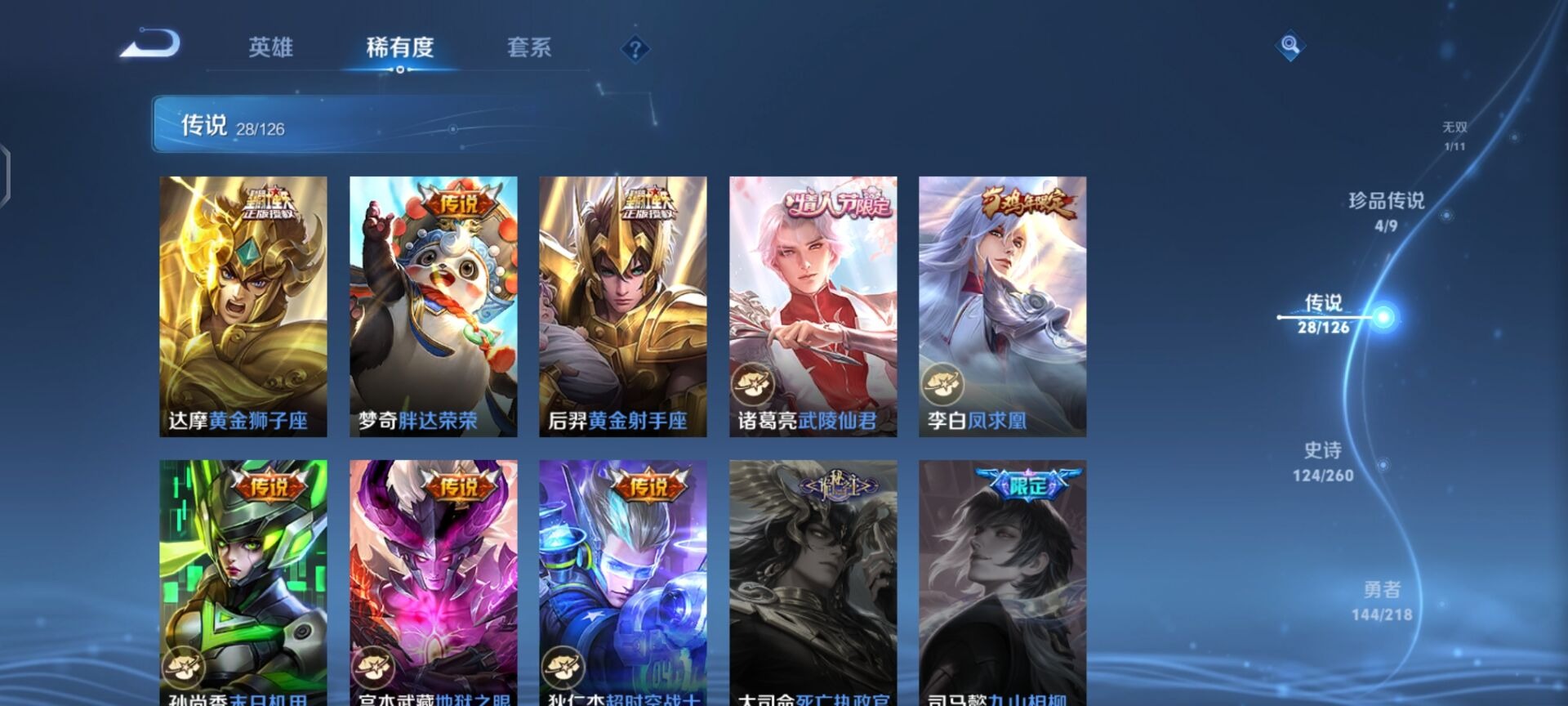 - PX_2084328-贵族等级: V5 英雄数: 111 皮肤数: 117 传说皮: 澜逐花归海 限定皮: 梁祝,五谷丰年