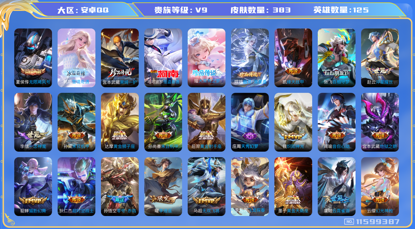 [11599387]V9 1典藏 1无双 4珍品传说 28传说 125英雄 383皮肤 可修改实名 优质装备:无限飓风号(高达),雪境奇遇-甄姬,怪盗基德,器灵·落星盏,大耳狗之梦,黑崎一护,黄金狮子座,黄金射手座,绛天战甲(鸡嘴战神),猫影幻舞,炽阳神光,一念神魔,云霓雀翎,末日机甲-孙尚香(绿蚂蚱),零号·赤焰,地狱之眼,飞鸢探春,音你心动-周瑜,胖达荣荣,李逍遥,淬星耀世,超时空战士-狄仁杰,末日机甲-孙策,无双飞将,天秀幻梦,百相守梦(张飞),黄金天蝎座 传说皮:幻光神枪 珍宝阁皮:万物之道,优雅恋人 限定皮:鸣野蒿,至尊宝,凤求凰(白切鸡),梅西,武陵仙君(小桃花),傲雪梅枪,白鹤梁神女,魔法小厨娘,白晶晶,玄嵩(庄周年限),五谷丰年,青龙志(铠年限),冰锋战神,武圣,天狼运算者,梁祝,御风骁将(吕布年限),天狼狩猎者,逐梦之星,岱宗(典韦年限),天狼溯光者,虎魄,天狼征服者,奔雷神使(牛魔年限),祈雪灵祝(雪兔子),李小龙,逐梦之光,玄武志(苏烈年限),辉光之辰,霸王别姬-项羽,奇迹圣诞,默契交锋-兰陵王,大圣娶亲,引擎之心,冰霜恋舞曲,云端筑梦师,神奇女侠,寅虎·心曲(虎婆),时之祈愿-云中君,唐三藏,梦圆繁星 史诗皮:化蝶舞,灵蛊蚀心,龙之律动,石田雨龙,星界战将,蒙犽顽岩魄,紫霞仙子,苍穹之光,电玩小子(小书包),黄金分割率,特工魅影,千年之狐,永昼,百相守梦(刘备),江河有灵,龙骑士(小龙虾),暗夜猫娘,白蛇,晚萤,冰冠公主,偶像歌手,末日机甲-吕布,猫狗日记-孙策,猫狗日记-大乔,时之恋人-孙尚香,乱世虎臣,节奏热浪,修罗,女仆咖啡,摇滚巨星,水果甜心,绅士熊喵,天才门将,星夜王子,心灵骇客,功夫厨神,德古拉伯爵,暗隐猎兽者,幽灵船长,鬼剑武藏,暗渊魔法,心灵战警,乐园奇幻夜,天秀·启明,舞动绿茵,地狱岩魂,纤云弄巧,繁星吟游(呼啦呼啦),缤纷独角兽,乘风破浪,逐浪之夏,龙鼓争鸣,月团寄思,水晶猎龙者,热力回旋,箭羽风息,金属风暴,圣诞狂欢,圣诞恋歌,鹰眼统帅,王者之锤,暗夜贵公子,魅力维加斯,雪上飞焰,奇遇舞章,天秀·音浪,天秀幻梦,滕王阁序,千筹问战,顽趣-阿古朵,未来纪元-赵云