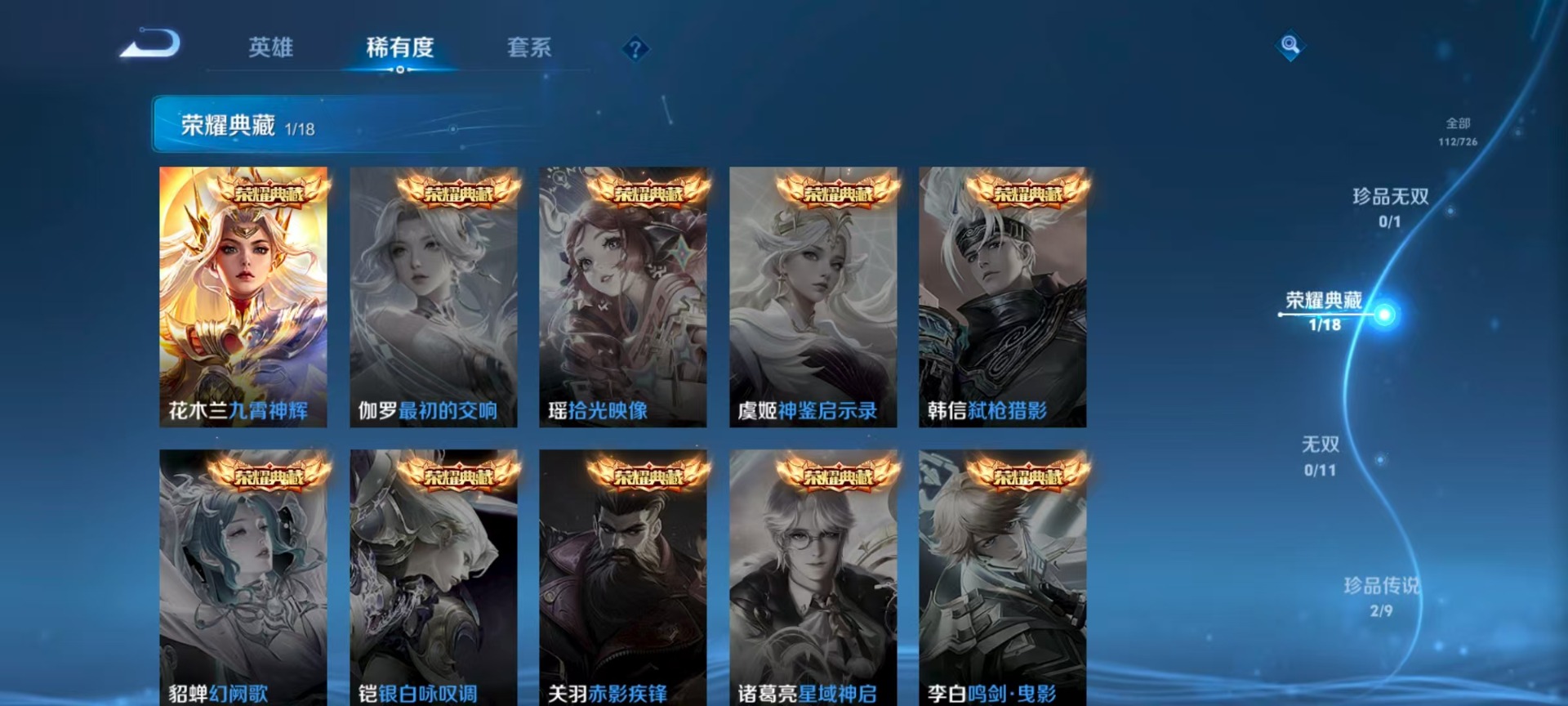 - PX_2073415-贵族等级: V6 英雄数: 123 皮肤数: 153 星传说: 未来机甲,星际治安官 传说皮: 末日机甲-孙尚香,超时空战士-狄仁杰 限定皮: 李小龙,朱雀志,五谷丰年,山海·玄木吟 亮点: 【店长推荐精品号】热门限定皮朱雀志山海玄木吟 星传说未来机甲星际治安官 100+玫瑰 低于万场练手号