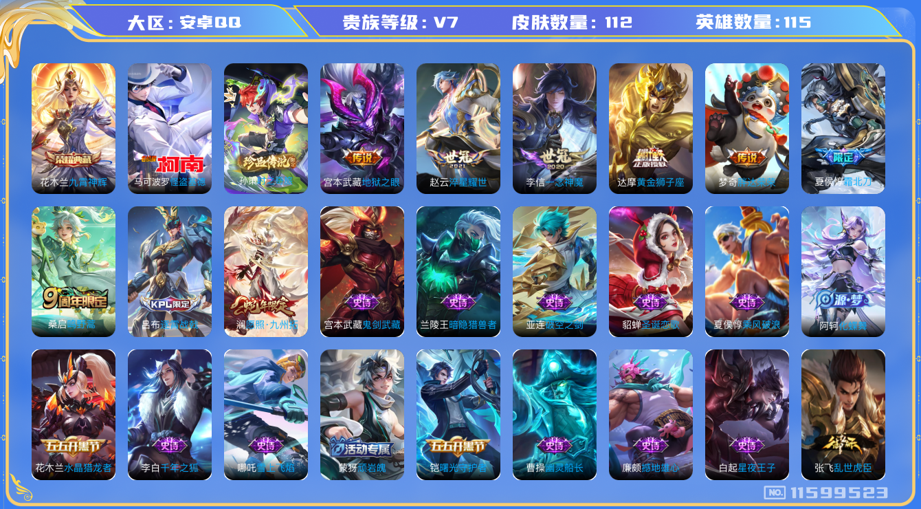 [11599523]V7 1典藏 2珍品传说 8传说 115英雄 112皮肤 可修改实名 优质装备:九霄神辉(木兰典藏),怪盗基德,黄金狮子座,一念神魔,地狱之眼,胖达荣荣,淬星耀世 珍品传说:时之奇旅-孙策 限定皮:愿照·九州拓(澜年限),逐霄战戟,鸣野蒿,夏侯惇霜北刀 史诗皮:器灵·浮梦炉,化蝶舞,撼地雄心,破空之剑,东方月初,蒙犽顽岩魄,埋骨钱,蔬乡物语(鲁班七号),苍穹之光,黄金分割率,千年之狐,冰冠公主,猫狗日记-孙策,乱世虎臣,水果甜心,绅士熊喵,天才门将,星夜王子,暗隐猎兽者,幽灵船长,鬼剑武藏,暗渊魔法,乘风破浪,水晶猎龙者,曙光守护者,圣诞狂欢,圣诞恋歌,鹰眼统帅,魅力维加斯,雪上飞焰