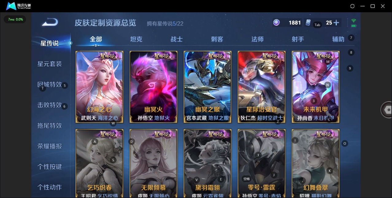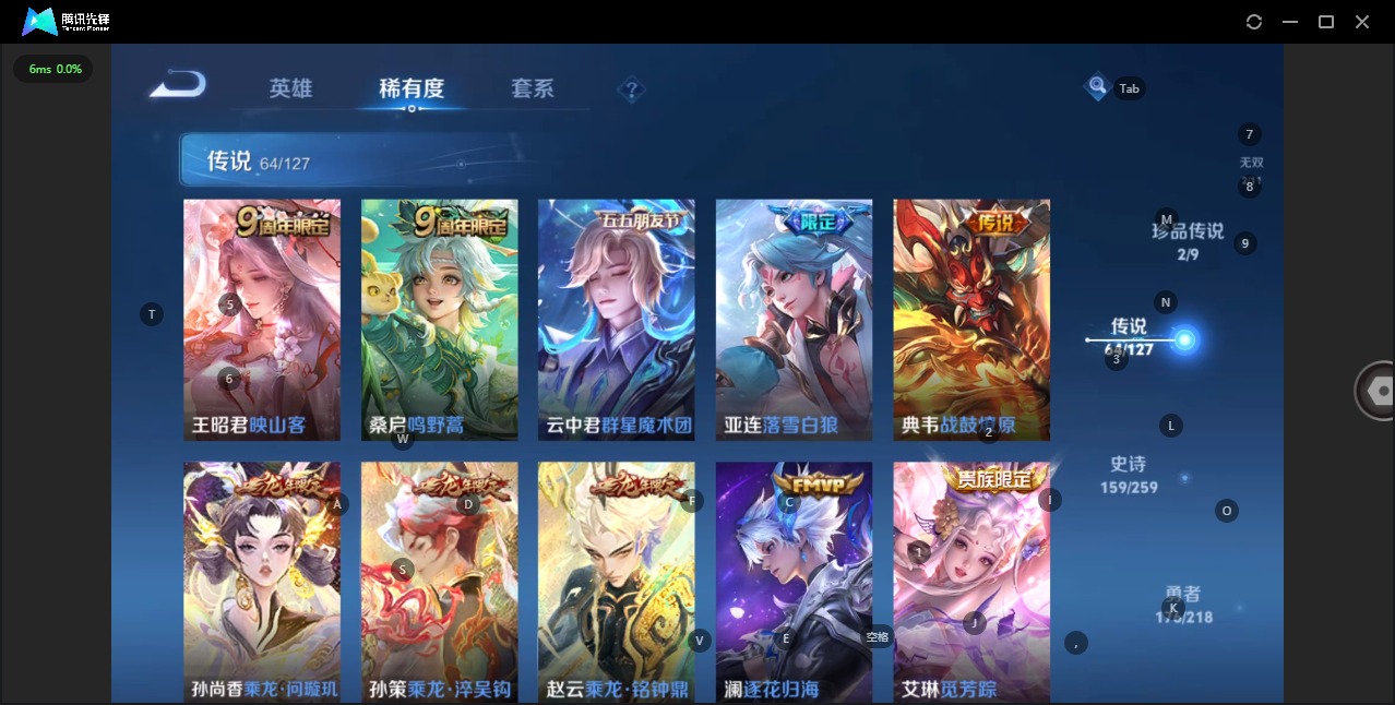 - PX_2086030-贵族等级: V8 英雄数: 123 皮肤数: 267 珍品传说: 器灵·落星盏 传说皮: 黄金白羊座,炽阳神光,一念神魔,地狱之眼,飞鸢探春,时之恋人-刘备,末日机甲-孙策,无双飞将,山海·苍雷引,浮生妄,妄想奇谈,霜月吟,澜逐花归海,幻光神枪,云诺千山 限定皮: 冰锋战神,李小龙,祈雪灵祝,梁祝,白晶晶,蜜橘之夏,逐梦之音,逐梦之光,美猴王,孙行者,匿光追影者,傲雪梅枪,寅