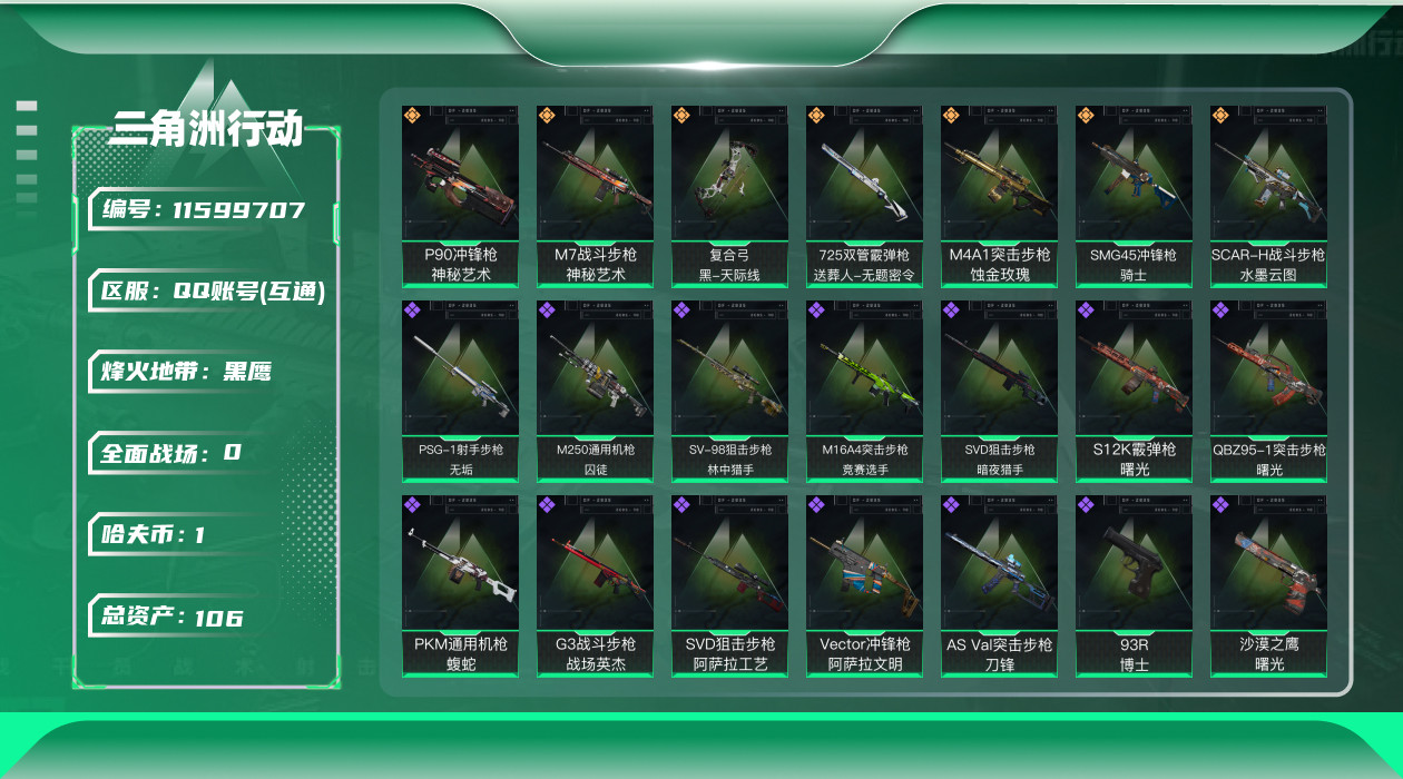 [11599707]总资产:106.9 1干员外观 7传说枪械 顶级安全箱(9.17到期) 可二次 可修改实名 烽火地带段位:黑鹰 全面战场段位:上等兵 哈夫币:1.051 传说武器皮肤:SCAR-H战斗步枪-水墨云图,SMG45冲锋枪-骑士,复合弓-黑-天际线,725双管霰弹枪-送葬人-无题密令,M4A1突击步枪-蚀金玫瑰,P90冲锋枪-神秘艺术,M7战斗步枪-神秘艺术 史诗武器皮肤:SR-3M紧凑突击步枪-英雄,AUG突击步枪-蝮蛇,M700狙击步枪-蝮蛇,PKM通用机枪-蝮蛇,G3战斗步枪-战场英杰,MP5冲锋枪-深海恐惧,勇士冲锋枪-深海恐惧,AKM突击步枪-林中猎手,SVD狙击步枪-暗夜猎手,M16A4突击步枪-竞赛选手,M1014霰弹枪-林中猎手,SV-98狙击步枪-林中猎手,PSG-1射手步枪-无垢,M250通用机枪-囚徒,QBZ95-1突击步枪-曙光,沙漠之鹰-曙光,SCAR-H-猎鳄行动,K416突击步枪-竞技风,Vector冲锋枪-阿萨拉文明,SVD狙击步枪-阿萨拉工艺,S12K霰弹枪-曙光,AS Val突击步枪-刀锋,M700狙击步枪-竞技风,QSZ92G-风林火山,93R-博士 干员外观:骇爪-水墨云图