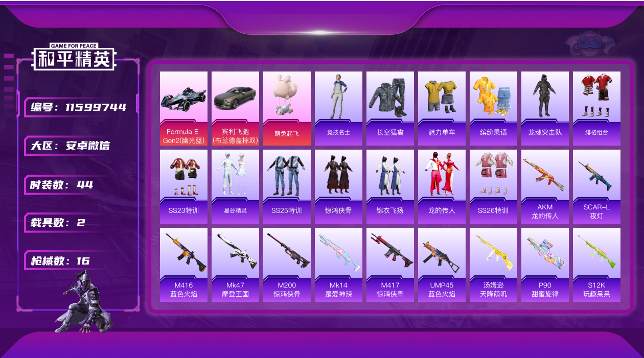 [11599744]2载具 2印记 可二次 可修改实名 优质装备:Formula E Gen2(幽光蓝),宾利飞驰(布罗德盖棕双色) 时装数:44 枪械数:16 战备数:2 载具:僚机-萌兔起飞 紫色装扮:SS23特训,长空猛禽,缤纷果语,魅力单车,龙的传人,龙魂突击队,竞技名士,惊鸿侠骨,SS25特训,锦衣飞扬,SS26特训,星谷精灵,绯格组合