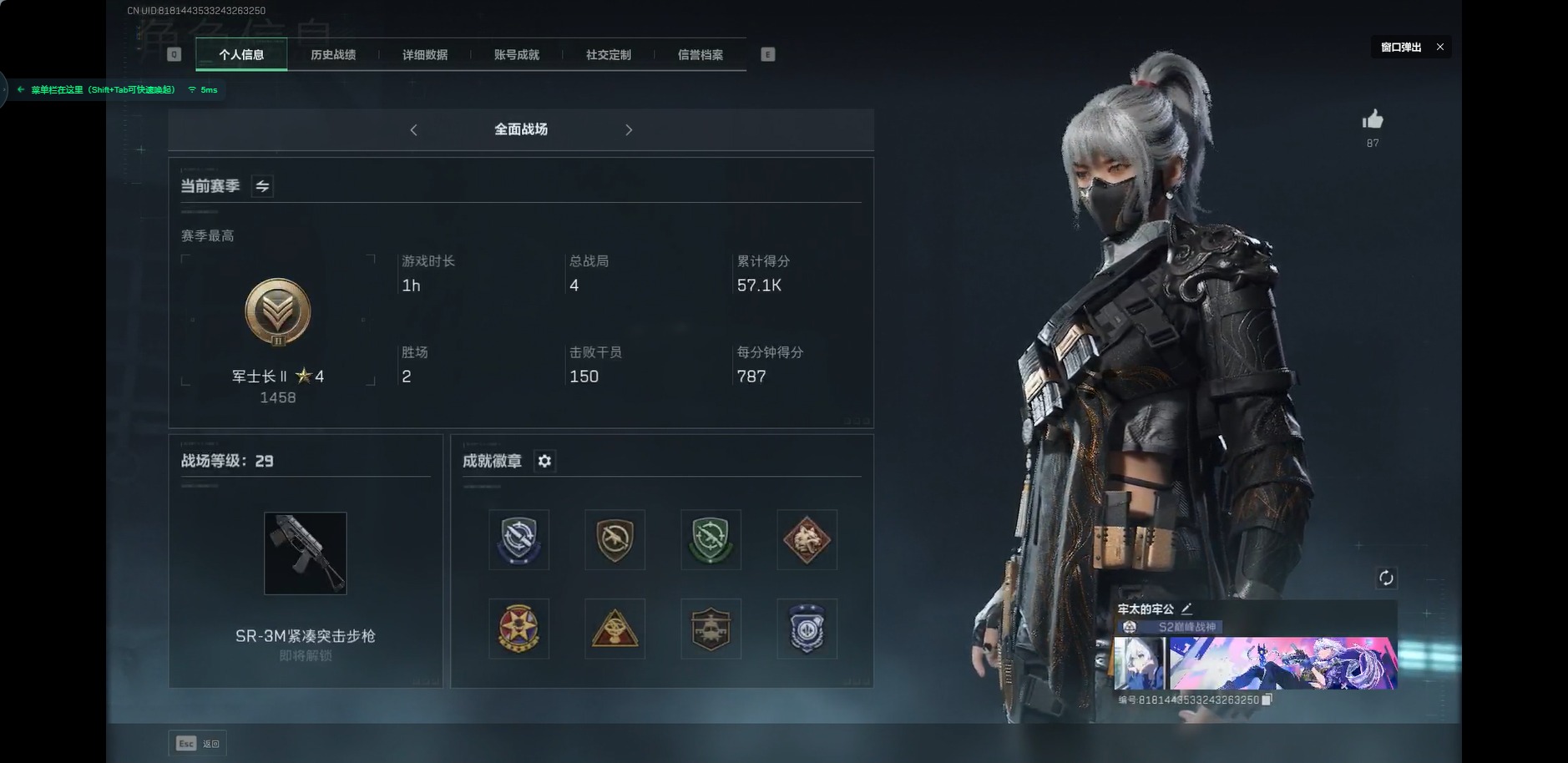 - [9879791]实名: 可修改 时装数: 664 载具数: 1 枪械数: 235 战备数: 166 热门装扮: 梦幻火箭(新101),呆萌铁蟹,数码大师,怪诞乔克,深海小丑鱼,天使彩虹糖,放客神游,鹰眼刺客,都市猎人,炙焰红王,冰霜白皇,冥河战士,洛天依,零号机款机体服,天之羽翼,海盐物语,闪耀律动,冰川红玫,冰川幽秘,兔兔白日梦,歌者泠鸢,赤蝎幽灵,派对舞王,天星战神 载具: 合金龙骨(绿),僚机-萌兔起飞 稀有枪皮: MG3洛神天依,UMP45雪国精灵,M416心之恋语,SCAR-L童趣迷兔,AUG星之彼岸,AKM梦之光华,GROZA焦糖拿铁,SCAR-L甜梦小狐,M416暖熊萌萌,P90甜蜜草莓,AKM盖世英雄,平底锅林间仙鹿,Kar98K-巳巳如意