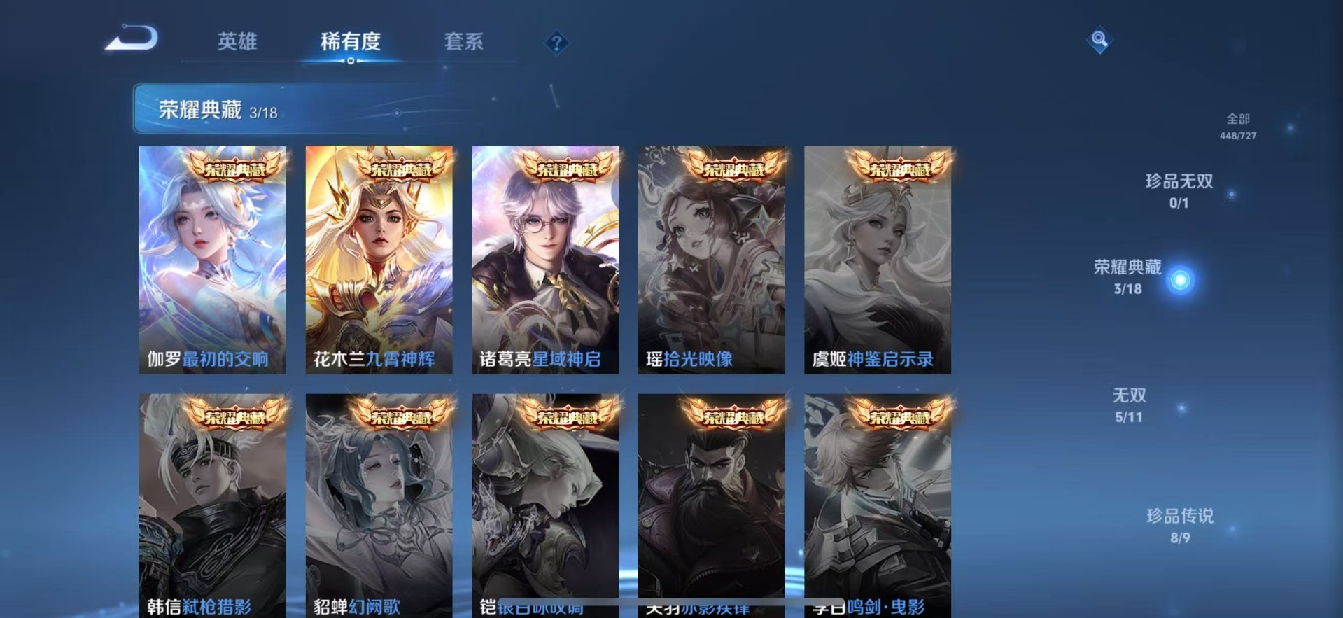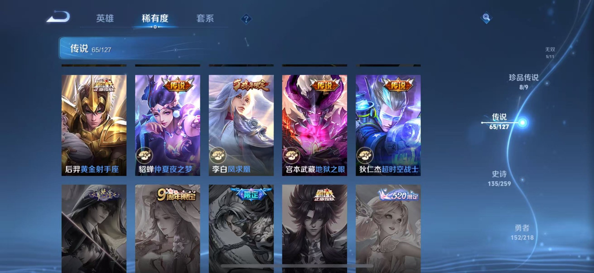 铠绛天战甲,刘备时之恋人,孙膑小动物乐团,张飞百相守梦,赵云淬星耀世,干将莫邪久胜战神,典韦战鼓燎原,干将莫邪画中仙,李信一念神魔,孙尚香音你闪耀,孙策末日机甲,达摩黄金狮子座,王昭君乞巧织情,露娜霜月吟,后羿千劫归真,庄周牧神诗旅,镜炽阳神光,周瑜音你心动,杨玉环星之鸣奏,公孙离记忆之芯,宫本武藏惊梅引,裴擒虎祥瑞亨通,貂蝉猫影幻舞,夏洛特浮生妄,艾琳觅芳踪,西施游龙清影,西施续相思,嬴政玄雷天君,张良黄金白羊座,孙悟空零号·赤焰,曜云鹰飞将,澜逐花归海,蔡文姬花朝如约,虞姬云霓雀翎,云缨幻光神枪