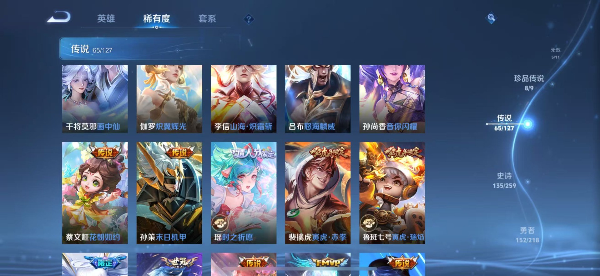 黄忠烈魂,甄姬女儿国国王,铠青龙志,廉颇寅虎·御盾,苏烈玄武志,孙膑寅虎·展翼,孙尚香异界灵契,鲁班七号寅虎·瑞焰,诸葛亮时雨天司,公孙离祈雪灵祝,杨玉环寅虎·心曲,司空震愿照·山河定,裴擒虎李小龙,裴擒虎寅虎·赤拳,上官婉儿梁祝,花木兰青春决赛季,马可波罗山海·玄木吟,桑启鸣野蒿,女娲愿照·千秋盛,孙悟空大圣娶亲,孙悟空至尊宝,马超神威,盘古冰霜神祇,妲己愿照·众生和,韩信傲雪梅枪,韩信飞衡,百里守约朱雀志,墨子降魔,蔡文姬愿照·福禄聚,瑶时之祈愿,澜愿照·九州拓,虞姬愿照·岁时盈,王昭君凤凰于飞,关羽冰锋战神
