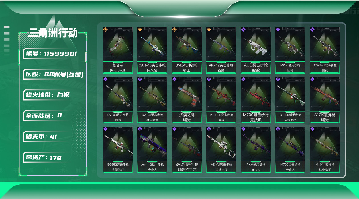 [11599901]总资产:179.9 1干员外观 4传说枪械 顶级安全箱(3×3)9.15号到期 可二次 可修改实名 烽火地带段位:白银 全面战场段位:尉官 哈夫币:41.319 传说武器皮肤:AK-12突击步枪-夜鹰,SMG45冲锋枪-骑士,复合弓-黑-天际线,CAR-15突击步枪-阿米娅 史诗武器皮肤:AUG突击步枪-蝮蛇,M700狙击步枪-蝮蛇,PKM通用机枪-蝮蛇,SR-25射手步枪-尖端治疗,AS Val突击步枪-尖端治疗,M700狙击步枪-守夜人,SG552突击步枪-尖端治疗,Ash-12战斗步枪-守夜人,MP5冲锋枪-深海恐惧,勇士冲锋枪-深海恐惧,SG552突击步枪-深海恐惧,AKM突击步枪-林中猎手,PKM通用机枪-守夜人,M1014霰弹枪-林中猎手,SV-98狙击步枪-林中猎手,PTR-32突击步枪-英雄,M250通用机枪-囚徒,SV-98狙击步枪-囚徒,SCAR-H战斗步枪-囚徒,沙漠之鹰-曙光,Vector冲锋枪-阿萨拉文明,SVD狙击步枪-阿萨拉工艺,S12K霰弹枪-曙光,PKM通用机枪-英雄,M700狙击步枪-竞技风 干员外观:无名-夜鹰