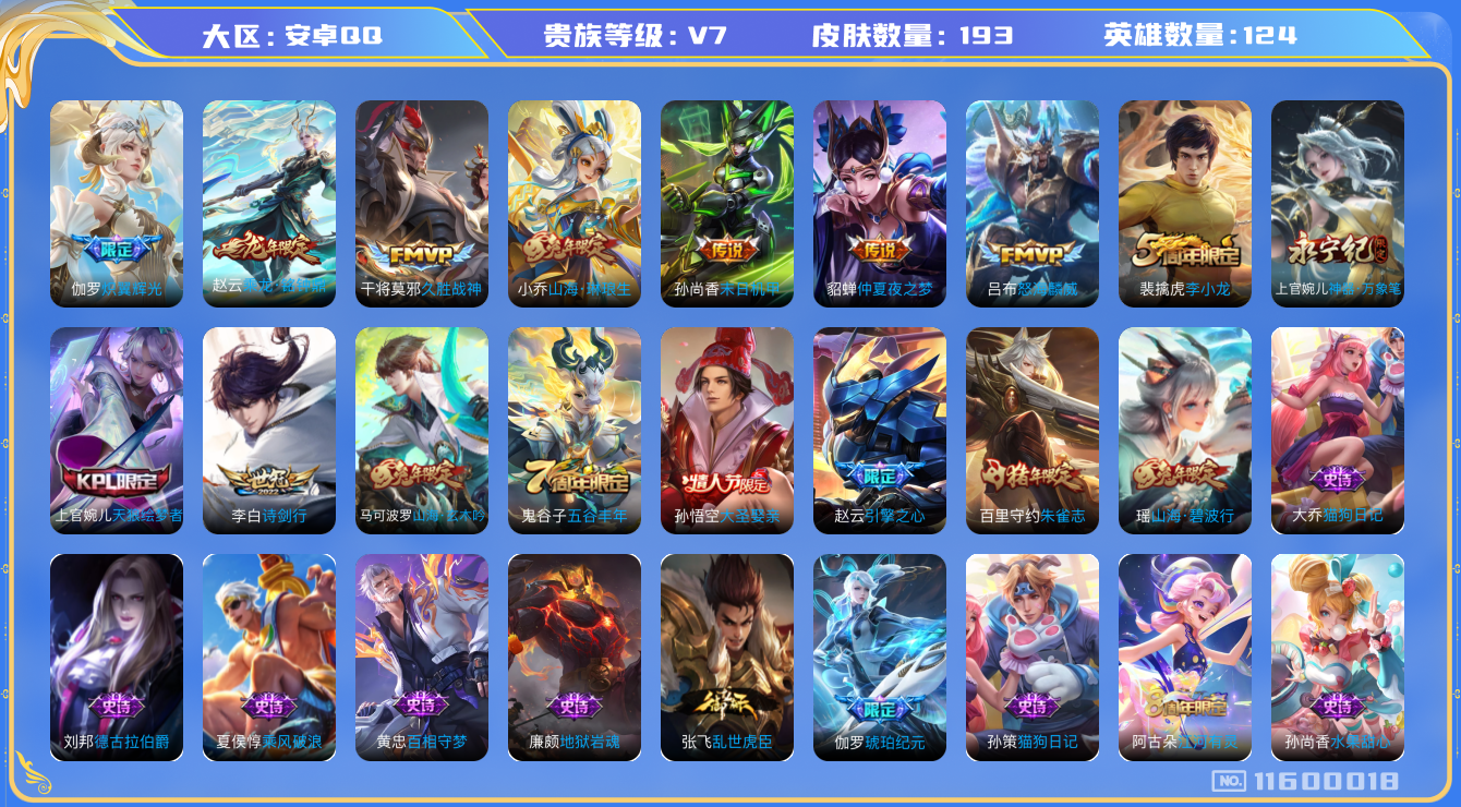[11600018]V7 8传说 124英雄 193皮肤 可修改实名 优质装备:久胜战神,末日机甲-孙尚香(绿蚂蚱),仲夏夜之梦(大飞蛾),山海·琳琅生(小乔年限),炽翼辉光(娃娃菜牛角包) 传说皮:乘龙·铭钟鼎(赵云年限) 珍宝阁皮:妄想食味,蔷薇恋人 限定皮:山海·碧波行(瑶年限),诗剑行,怒海麟威,五谷丰年,天狼绘梦者,李小龙,朱雀志(守约年限),大圣娶亲,引擎之心,神器·万象笔,山海·玄木吟(马可年限) 史诗皮:星界战将,龙之律动,百相守梦-黄忠,琥珀纪元伽罗,苍穹之光,电玩小子(小书包),白龙吟,永昼,浮梦罗烟,江河有灵,蒙恬荣光圣徽,魅语,电玩·爆裂旋风,末日机甲-吕布,猫狗日记-孙策,猫狗日记-大乔,乱世虎臣,摇滚巨星,水果甜心,天才门将,心灵骇客,功夫厨神,德古拉伯爵,暗隐猎兽者,鬼剑武藏,暗渊魔法,心灵战警,舞动绿茵,地狱岩魂,拒霜思,乘风破浪,逐浪之夏,水晶猎龙者,金属风暴,原初追逐者,圣诞狂欢,圣诞恋歌,鹰眼统帅,魅力维加斯,黎明之约,无心