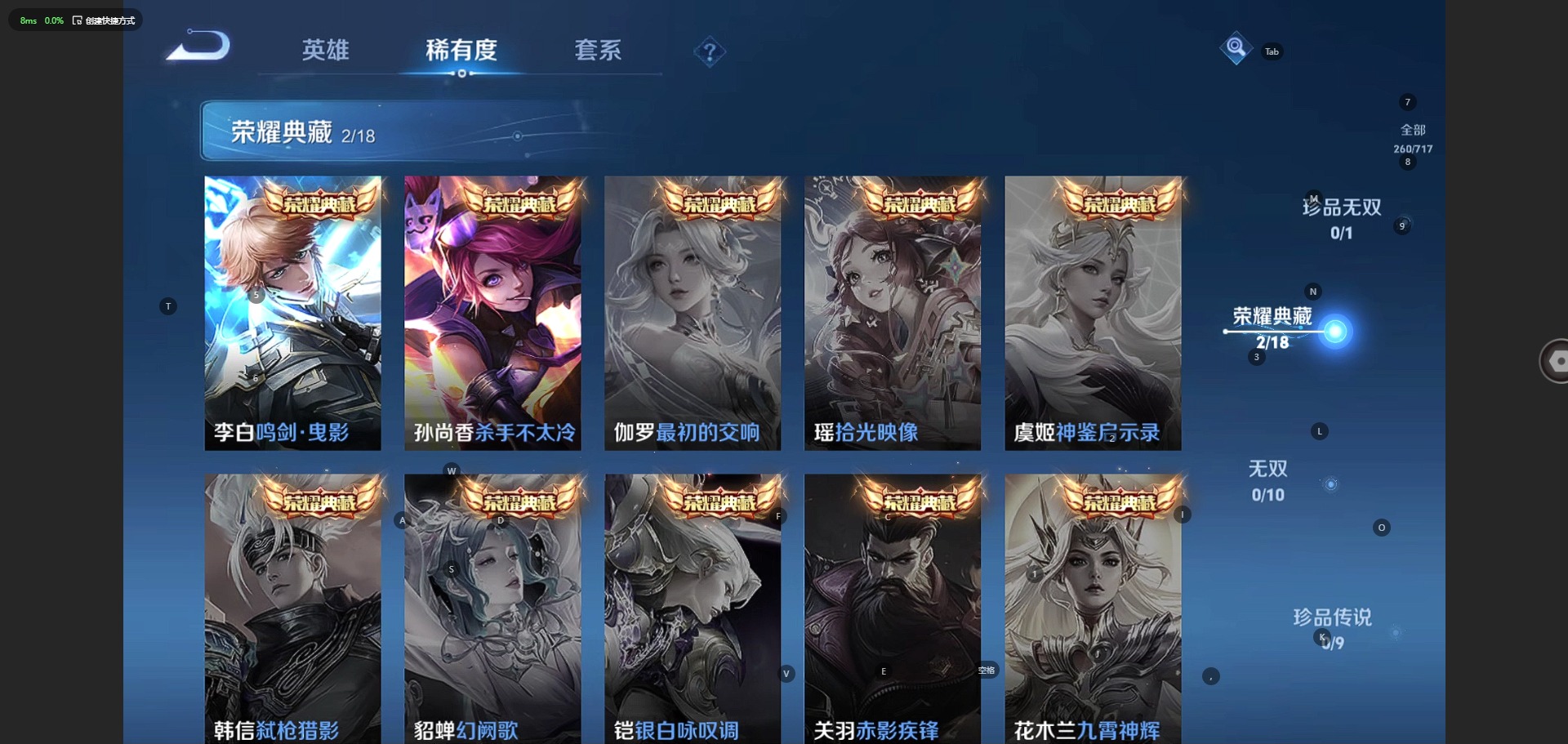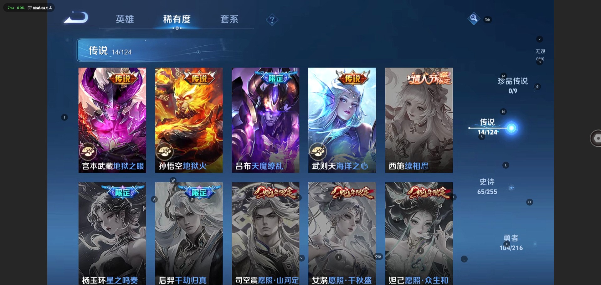 - [11843705]V6 5传说 122英雄 171皮肤 可修改实名 女号 优质装备:冠军飞将,云鹰飞将(小将军) 珍宝阁皮:蔷薇恋人,玩趣恶龙 限定皮:愿照·九州拓(澜年限),鸣野蒿,白虎志(电光耗子),飞衡(韩信年限),高山流水,梁祝,李小龙,朱雀志(守约年限),辉光之辰,引擎之心,冰霜恋舞曲 史诗皮:器灵·浮梦炉,化蝶舞,紫霞仙子,特工魅影,千年之狐,匿光破解者,电玩·爆裂旋风,江河有灵,百解令(蒙犽),蒙恬荣光圣徽,暗夜猫娘,魅语,冰冠公主,乱世虎臣,修罗,摇滚巨星,水果甜心,绅士熊喵,星夜王子,心灵骇客,功夫厨神,暗隐猎兽者,幽灵船长,鬼剑武藏,纤云弄巧,缤纷独角兽,乘风破浪,月团寄思,金属风暴,原初追逐者,圣诞恋歌,鹰眼统帅,魅力维加斯