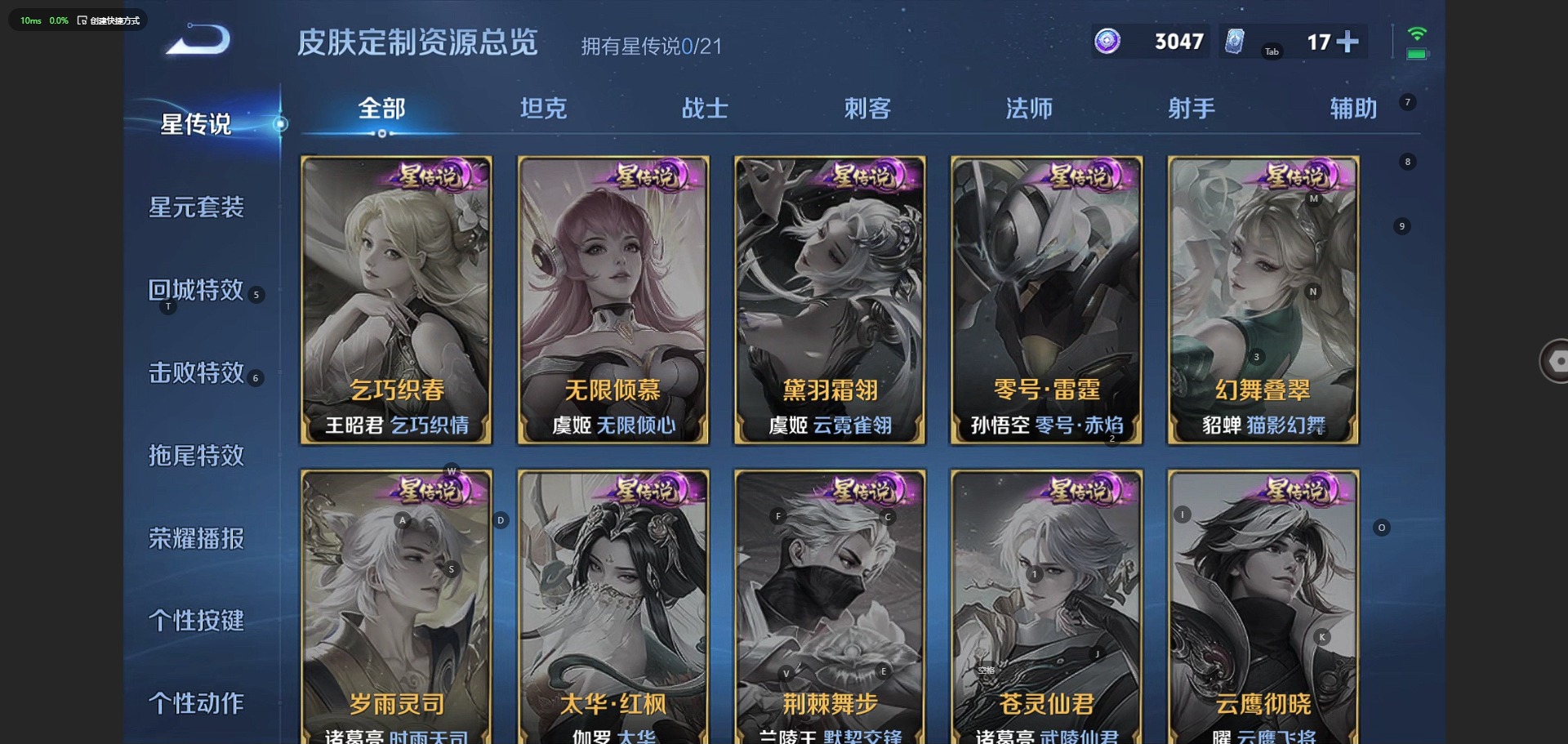刘邦德古拉伯爵,夏侯惇乘风破浪,阿轲暗夜猫娘,铠曙光守护者,廉颇地狱岩魂,伽罗箭羽风息,小乔缤纷独角兽,孙策猫狗日记,赵怀真器灵·浮梦炉,吕布圣诞狂欢,露娜紫霞仙子,吕布末日机甲,宫本武藏鬼剑武藏,公孙离无限星赏官,兰陵王暗隐猎兽者,貂蝉圣诞恋歌,花木兰水晶猎龙者,夏洛特永昼,李白千年之狐,艾琳奇遇舞章,白起星夜王子,白起苍鳞隐世,亚瑟心灵战警,嬴政摇滚巨星,嬴政暗夜贵公子,程咬金功夫厨神,百里玄策原初追逐者,雅典娜冰冠公主,韩信白龙吟,百里守约特工魅影,李元芳逐浪之夏,墨子龙骑士,澜赏金猎手,娜可露露晚萤,王昭君偶像歌手