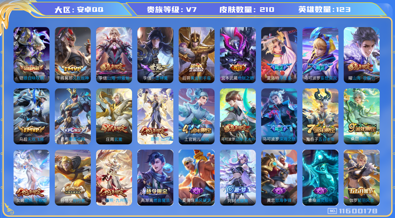 [11600178]V7 1典藏 14传说 123英雄 210皮肤 可修改实名 优质装备:银白咏叹调(倪克斯侍卫),黄金射手座,久胜战神,一念神魔,地狱之眼,无双飞将,山海·炽霜斩(李信年限),山海·苍雷引(电光曜子),浮生妄,妄想实况 珍宝阁皮:胡桃夹子,女武神 限定皮:愿照·九州拓(澜年限),愿照·山河定(司空震年限),愿照·千秋盛(女娲年限),逐霄战戟,鸣野蒿,玄嵩(庄周年限),五谷丰年,梁祝,孙行者,深海之息(深海大菠萝),山海·玄木吟(马可年限) 史诗皮:鸭鸭历险记-刘禅,苍鳞隐世,化蝶舞,星界战将,谪仙醉月,龙之律动,茶境仙,怒海争锋,紫霞仙子,黄金分割率,特工魅影,千年之狐,江河有灵,百解令(蒙犽),高渐离燃音魔法,蒙恬荣光圣徽,末日机甲-吕布,猫狗日记-孙策,水果甜心,天才门将,星夜王子,暗隐猎兽者,幽灵船长,鬼剑武藏,心灵战警,地狱岩魂,纤云弄巧,拒霜思,缤纷独角兽,乘风破浪,水晶猎龙者,箭羽风息,金属风暴,原初追逐者,圣诞恋歌,鹰眼统帅,无心,未来纪元-赵云