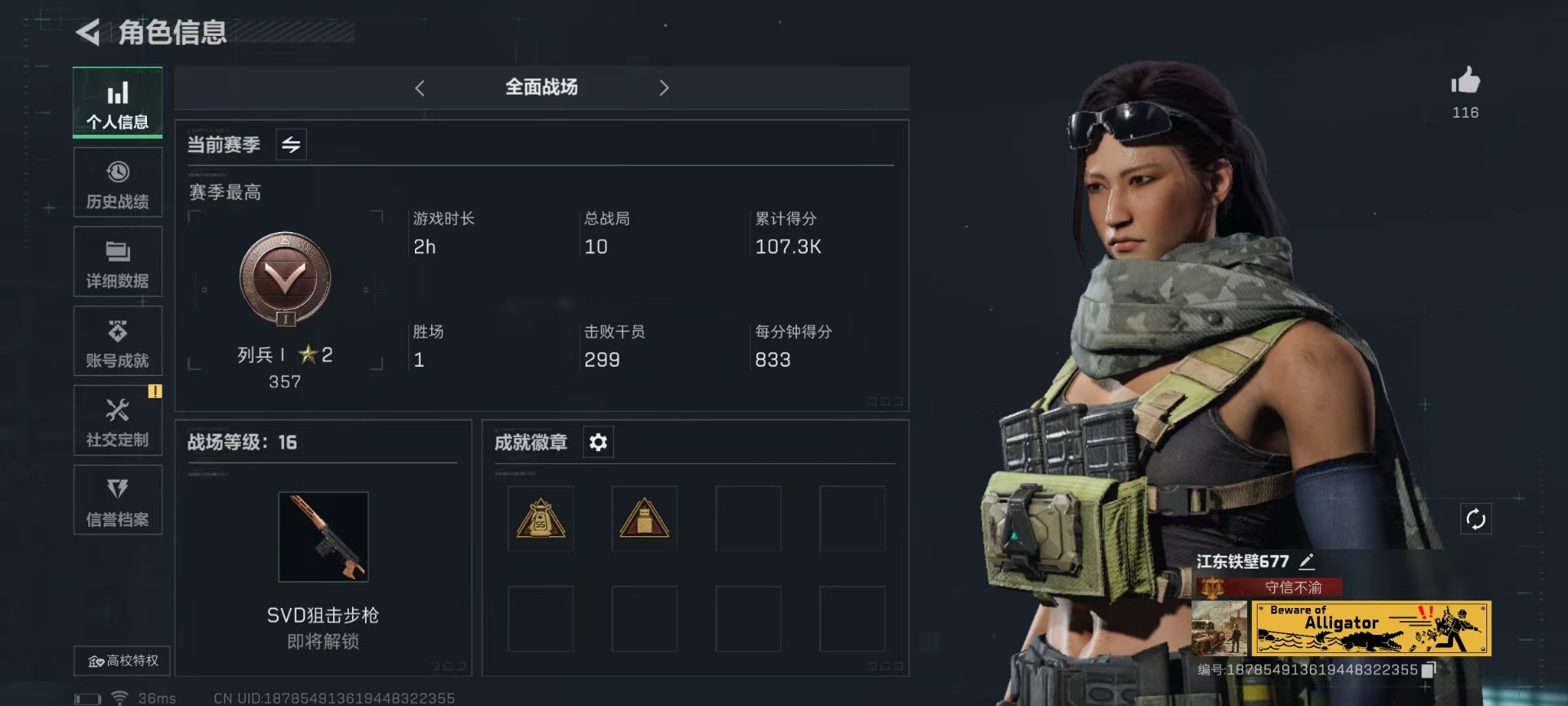 - [11524018]总资产:100.3M 6传说枪械 哈夫币:77.651K 进阶安全箱(2×2)9.15号到期 可二次 可修改实名 烽火地带段位:黄金 全面战场段位:无段位 传说武器皮肤:CAR-15突击步枪-阿米娅,复合弓-黑-天际线,AK-12突击步枪-特斯拉线圈,SR-3M紧凑突击步枪-特斯拉线圈,UZI冲锋枪-特斯拉线圈,勇士冲锋枪-能天使-午夜邮差 史诗武器皮肤:勇士冲锋枪-深海恐惧,SV-98狙击步枪-林中猎手,SCAR-H战斗步枪-囚徒