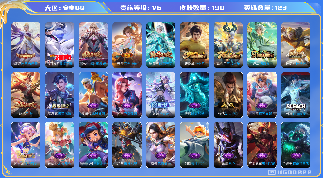 [11600222]V6 1典藏 1珍品传说 4传说 123英雄 190皮肤 可修改实名 优质装备:神鉴启示录,怪盗基德,山海·炽霜斩(李信年限) 传说皮:幻光神枪 珍宝阁皮:万物之道,蔷薇恋人,玩趣恶龙 限定皮:鸣野蒿,时雨天司(水龙头),飞衡(韩信年限),五谷丰年,李小龙,孙行者 史诗皮:化蝶舞,灵蛊蚀心,龙之律动,石田雨龙,紫霞仙子,电玩小子(小书包),特工魅影,千年之狐,江河有灵,高渐离燃音魔法,末日机甲-吕布,猫狗日记-孙策,乱世虎臣,节奏热浪,女仆咖啡,水果甜心,天才门将,星夜王子,心灵骇客,功夫厨神,暗隐猎兽者,幽灵船长,鬼剑武藏,舞动绿茵,繁星吟游(呼啦呼啦),乘风破浪,水晶猎龙者,唤灵魅影,金属风暴,鹰眼统帅,魅力维加斯,赏金猎手,无心,未来纪元-赵云