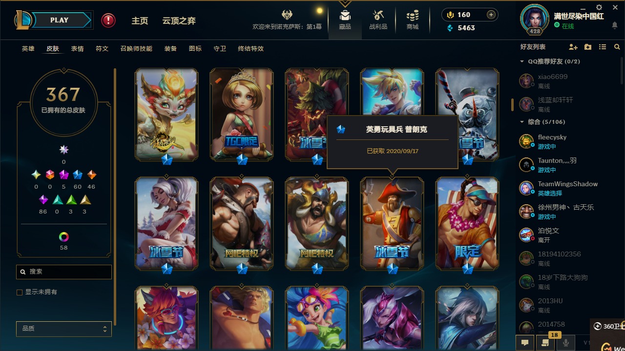 - [11996580]V8 1典藏 13传说 125英雄 329皮肤 可修改实名 优质装备:弑枪猎影(韩信典藏),云鹰飞将(小将军),炽阳神光,一念神魔,末日机甲-孙尚香(绿蚂蚱),地狱之眼,无双飞将,山海·炽霜斩(李信年限),澜逐花归海,琥珀纪元马超,涂山容容 传说皮:幻光神枪 珍宝阁皮:胡桃夹子,优雅恋人,女武神 限定皮:逐霄战戟,鸣野蒿,五谷丰年,冰锋战神,武圣,梁祝,李小龙,朱雀志(守约年限),默契交锋-花木兰,孙行者,大圣娶亲,山海·玄木吟(马可年限) 史诗皮:星界战将,谪仙醉月,龙之律动,破空之剑,战舞者,琥珀纪元伽罗,蔬乡物语(鲁班七号),百相守梦-百里守约,百相守梦-黄忠,遇见神鹿,紫霞仙子,苍穹之光,电玩小子(小书包),黄金分割率,特工魅影,千年之狐,江河有灵,魅语,百解令(蒙犽),高渐离燃音魔法,蒙恬荣光圣徽,无限星赏官,冰冠公主,偶像歌手,白蛇,电玩·爆裂旋风,龙骑士(小龙虾),末日机甲-吕布,猫狗日记-孙策,猫狗日记-大乔,时之恋人-孙尚香,乱世虎臣,节奏热浪,修罗,女仆咖啡,摇滚巨星,水果甜心,绅士熊喵,天才门将,星夜王子,心灵骇客,功夫厨神,德古拉伯爵,暗隐猎兽者,幽灵船长,鬼剑武藏,心灵战警,天秀·启明,舞动绿茵,地狱岩魂,诗语江南,纤云弄巧,繁星吟游(呼啦呼啦),缤纷独角兽,乘风破浪,逐浪之夏,水晶猎龙者,曙光守护者,箭羽风息,金属风暴,原初追逐者,圣诞狂欢,圣诞恋歌,鹰眼统帅,暗夜贵公子,魅力维加斯,黎明之约,赏金猎手,无心,未来纪元-赵云