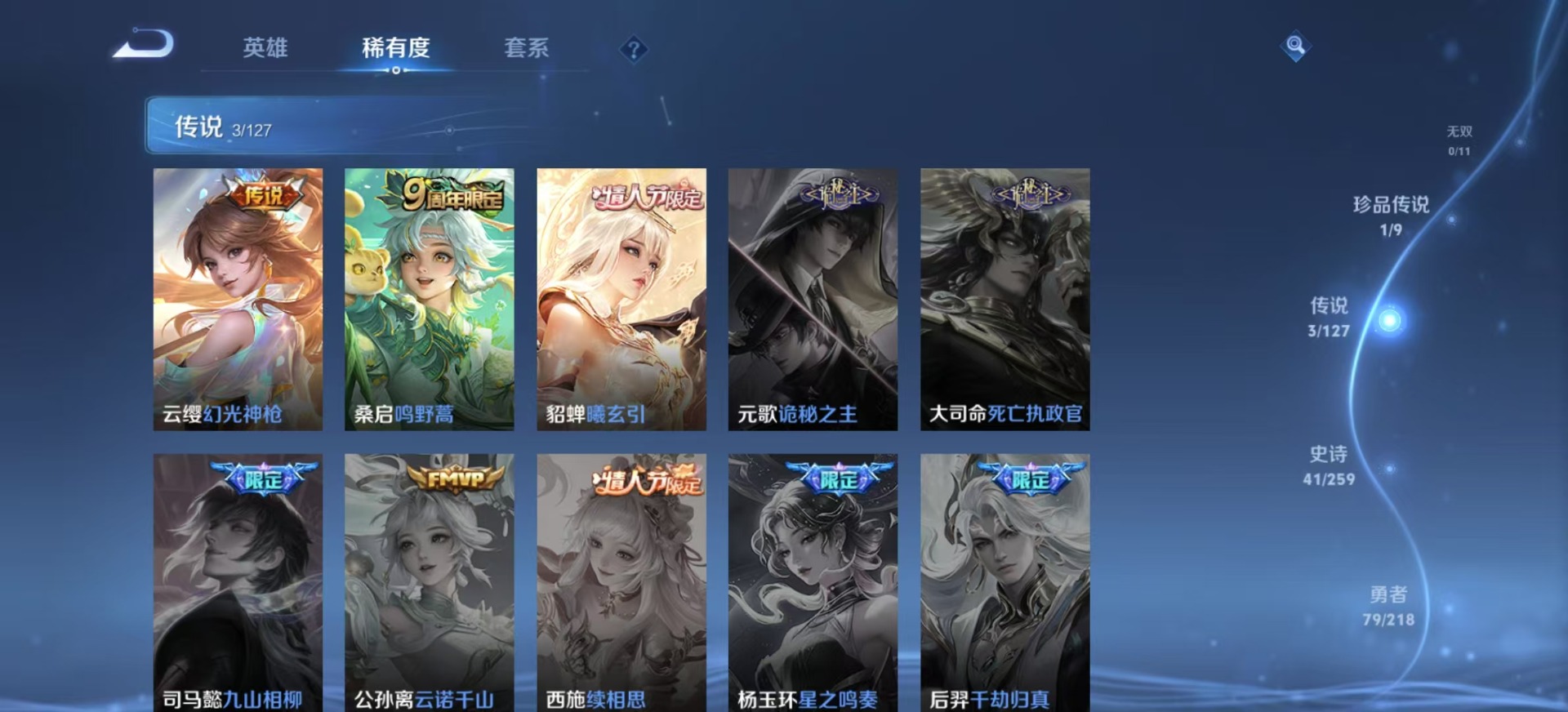 - [11817099]V10 2典藏 2无双 1珍品传说 55传说 126英雄 466皮肤 典藏英雄武则天 可修改实名 优质装备:杀手不太冷,全息碎影(猴子典藏),小乔时之魔女(小乔无双),器灵·螭龙剑,器灵·落星盏,黄金狮子座,黄金射手座,冠军飞将,云鹰飞将(小将军),绛天战甲(鸡嘴战神),黄金白羊座,猫影幻舞,久胜战神,炽阳神光,地狱火,仲夏夜之梦(大飞蛾),零号·赤焰,海洋之心,地狱之眼,乞巧织情,时之恋人-刘备(电焊工),游龙清影(小青龙),超时空战士-狄仁杰,末日机甲-孙策,无双飞将,碎云,山海·炽霜斩(李信年限),画中仙,浮生妄,记忆之芯(机甲兔),灼幽烈阳,鲁班七号-时之奇旅,霜月吟,澜逐花归海,艾琳觅芳踪,牧神诗旅,玄雷天君,千劫归真,千山共赴,涂山容容 传说皮:典韦战鼓燎原,云诺千山,续相思,星之鸣奏,祥瑞亨通,幻光神枪 珍宝阁皮:万物之道,优雅恋人,女武神 限定皮:愿照·九州拓(澜年限),愿照·福禄聚(蔡文姬年限),愿照·岁时盈(虞姬年限),愿照·山河定(司空震年限),愿照·众生和(妲己年限),愿照·千秋盛(女娲年限),逐霄战戟,映山客,陌上桑,鸣野蒿,至尊宝,傲雪梅枪,绯月行,时之彼端,魔法小厨娘,白晶晶,时雨天司(水龙头),神威(电光马子),山海·碧波行(瑶年限),诗剑行,齐天大圣,怒海麟威,五谷丰年,冰锋战神,游园惊梦,梁祝,御风骁将(吕布年限),烈魂,逐梦之音,祈雪灵祝(雪兔子),李小龙,朱雀志(守约年限),圣诞老人,一生所爱,大圣娶亲,引擎之心,冰霜恋舞曲,美猴王,神器·万象笔,山海·玄木吟(马可年限),冰霜神祇 史诗皮:鸭鸭历险记-刘禅,飞车小橘子,苍鳞隐世,器灵·浮梦炉,糖绘人间,狼魂孤将,绮世丹青,瑰影绮梦,化蝶舞,灵蛊蚀心,星界战将,谪仙醉月,雪豹·霜爪,藏狐·褐绒,石田雨龙,戍鼓铭心,茶境仙,幻珠鲛人,怒海争锋,炽弈燎原,破空之剑,东方月初,蒙犽顽岩魄,芈月浮光幕影,琥珀纪元伽罗,决胜骁骑,上官婉儿群星魔术团,蔬乡物语(鲁班七号),百相守梦-百里守约,星界特工,百相守梦-黄忠,遇见神鹿,紫霞仙子,苍穹之光,电玩小子(小书包),白龙吟,黄金分割率,特工魅影,千年之狐,永昼,江河有灵,真我赫兹(百里守约),完美假期,魅语,高渐离燃音魔法,蒙恬荣光圣徽,无限星赏官,匿光破解者,冰冠公主,青蛇,偶像歌手,白蛇,晚萤,暗夜猫娘,百相守梦(关羽),银翎春