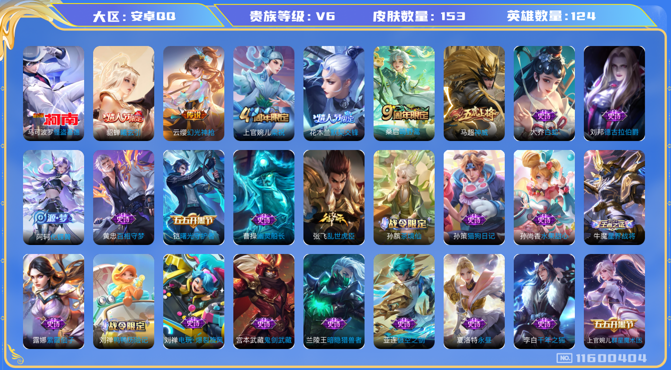 [11600404]V6 1珍品传说 3传说 124英雄 153皮肤 可修改实名 优质装备:怪盗基德 传说皮:貂蝉曦玄引,幻光神枪 珍宝阁皮:蔷薇恋人 限定皮:鸣野蒿,神威(电光马子),梁祝,默契交锋-花木兰 史诗皮:鸭鸭历险记-刘禅,化蝶舞,星界战将,茶境仙,破空之剑,上官婉儿群星魔术团,百相守梦-百里守约,百相守梦-黄忠,紫霞仙子,特工魅影,千年之狐,永昼,电玩·爆裂旋风,白蛇,冰冠公主,猫狗日记-孙策,乱世虎臣,女仆咖啡,水果甜心,星夜王子,德古拉伯爵,暗隐猎兽者,幽灵船长,鬼剑武藏,心灵战警,逐浪之夏,曙光守护者,鹰眼统帅,暗夜贵公子,魅力维加斯,黎明之约