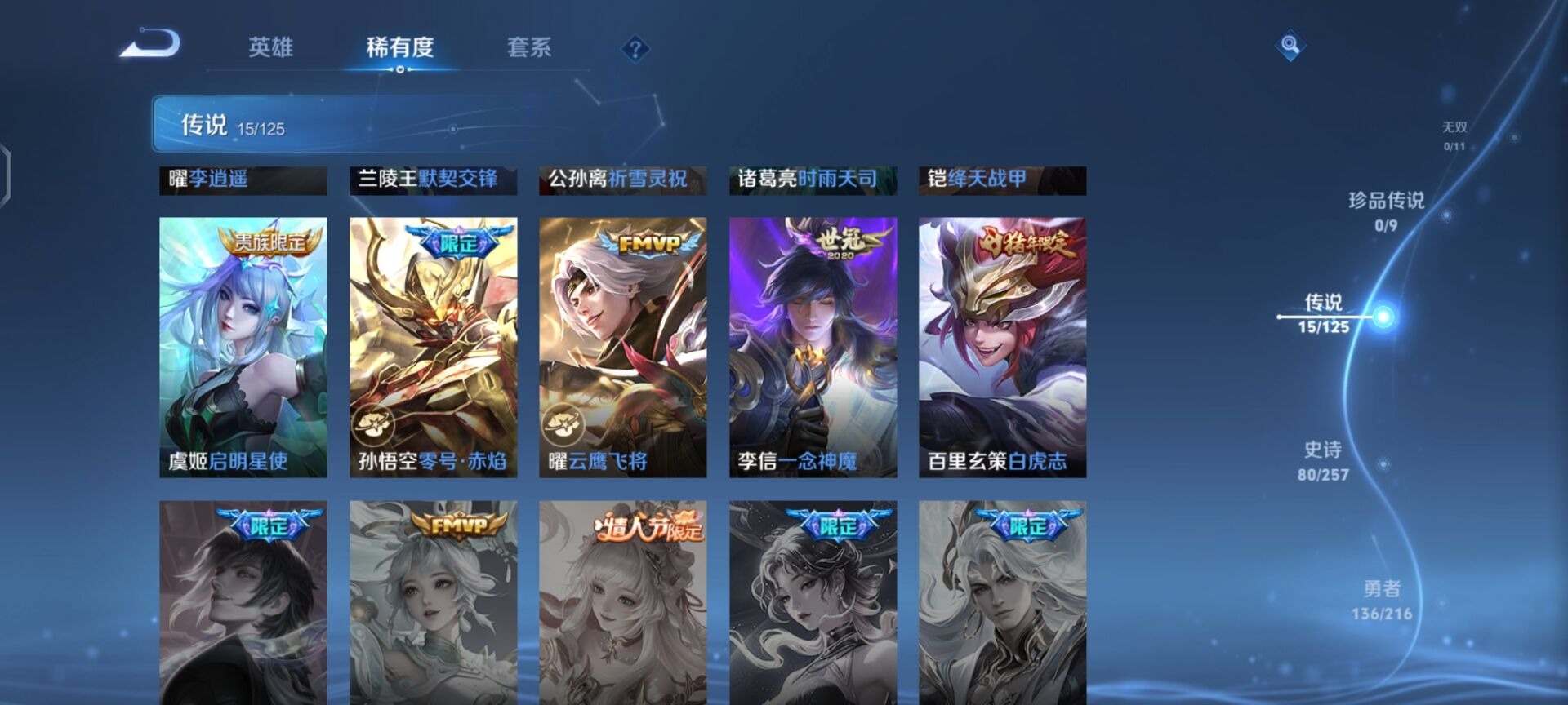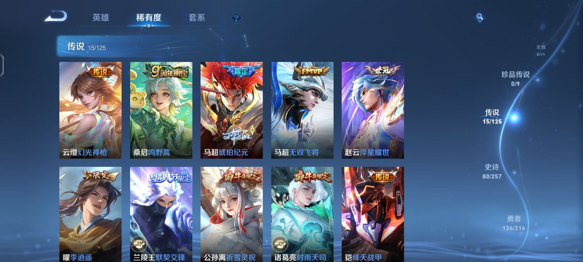 - [12091371]V7 1典藏 10传说 124英雄 165皮肤 可修改实名 优质装备:全息碎影(猴子典藏),云鹰飞将(小将军),炽阳神光,无双飞将,澜逐花归海 传说皮:典韦战鼓燎原,九山相柳,祥瑞亨通,幻光神枪 珍宝阁皮:妄想食味,胡桃夹子 限定皮:愿照·九州拓(澜年限),逐霄战戟,鸣野蒿,五谷丰年,神器·万象笔 史诗皮:鸭鸭历险记-刘禅,星界战将,龙之律动,茶境仙,蒙犽顽岩魄,蔬乡物语(鲁班七号),百相守梦-黄忠,紫霞仙子,黄金分割率,特工魅影,江河有灵,魅语,偶像歌手,末日机甲-吕布,时之恋人-孙尚香,乱世虎臣,节奏热浪,女仆咖啡,摇滚巨星,水果甜心,星夜王子,德古拉伯爵,暗隐猎兽者,幽灵船长,鬼剑武藏,暗渊魔法,舞动绿茵,乘风破浪,逐浪之夏,水晶猎龙者,金属风暴,原初追逐者,圣诞狂欢,圣诞恋歌,鹰眼统帅,魅力维加斯,无心,未来纪元-赵云