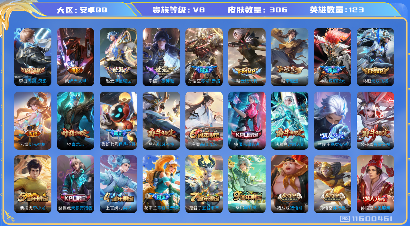 [11600461]V8 1典藏 15传说 123英雄 306皮肤 可修改实名 优质装备:鸣剑·曳影,云鹰飞将(小将军),绛天战甲(鸡嘴战神),一念神魔,零号·赤焰,李逍遥,淬星耀世,无双飞将,琥珀纪元马超 传说皮:幻光神枪 珍宝阁皮:妄想食味,蔷薇恋人,女武神 限定皮:鸣野蒿,白虎志(电光耗子),时雨天司(水龙头),神威(电光马子),飞衡(韩信年限),高山流水,五谷丰年,青龙志(铠年限),冰锋战神,梁祝,御风骁将(吕布年限),天狼狩猎者,祈雪灵祝(雪兔子),李小龙,朱雀志(守约年限),默契交锋-兰陵王,孙行者,猪悟能,大圣娶亲,青春决赛季,乒乒小将,匿光追影者 史诗皮:龙之律动,石田雨龙,百相守梦-黄忠,紫霞仙子,电玩小子(小书包),白龙吟,特工魅影,千年之狐,江河有灵,百解令(蒙犽),偶像歌手,晚萤,电玩·爆裂旋风,末日机甲-吕布,猫狗日记-孙策,时之恋人-孙尚香,乱世虎臣,节奏热浪,修罗,女仆咖啡,摇滚巨星,水果甜心,天才门将,星夜王子,心灵骇客,功夫厨神,暗隐猎兽者,幽灵船长,鬼剑武藏,心灵战警,地狱岩魂,纤云弄巧,繁星吟游(呼啦呼啦),拒霜思,缤纷独角兽,乘风破浪,逐浪之夏,水晶猎龙者,曙光守护者,箭羽风息,金属风暴,圣诞狂欢,圣诞恋歌,鹰眼统帅,魅力维加斯,赏金猎手,无心,未来纪元-赵云