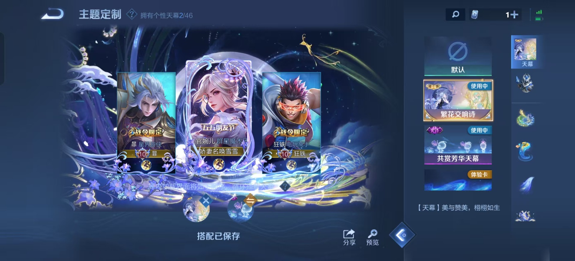 曹操天狼征服者,伽罗天狼溯光者,伽罗太华,孙膑天狼运算者,后羿辉光之辰,司空震愿照·山河定,裴擒虎李小龙,上官婉儿梁祝,李白诗剑行,安琪拉魔法小厨娘,马可波罗逐梦之星,艾琳陌上桑,桑启鸣野蒿,女娲愿照·千秋盛,孙悟空孙行者,孙悟空大圣娶亲,孙悟空至尊宝,孙悟空美猴王,妲己愿照·众生和,韩信飞衡,蔡文姬愿照·福禄聚,澜愿照·九州拓,虞姬愿照·岁时盈,妲己热情桑巴,关羽冰锋战神