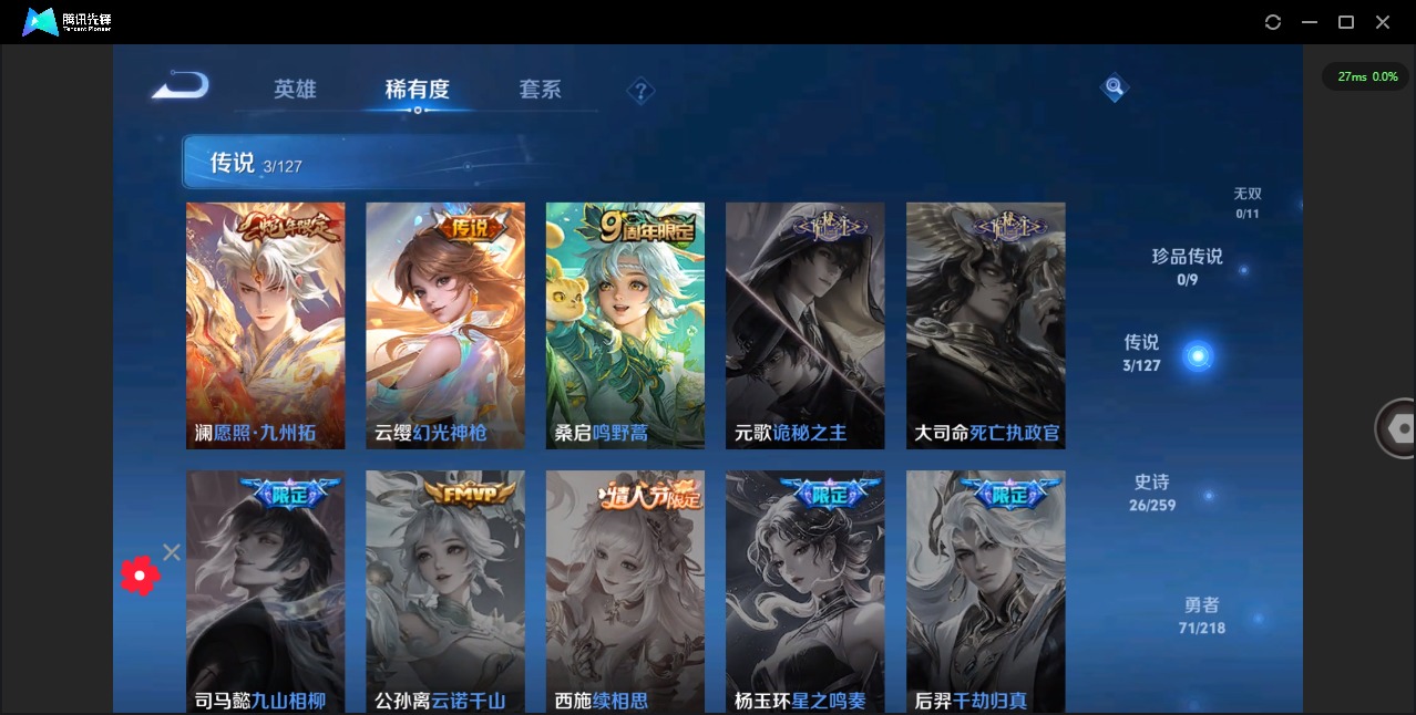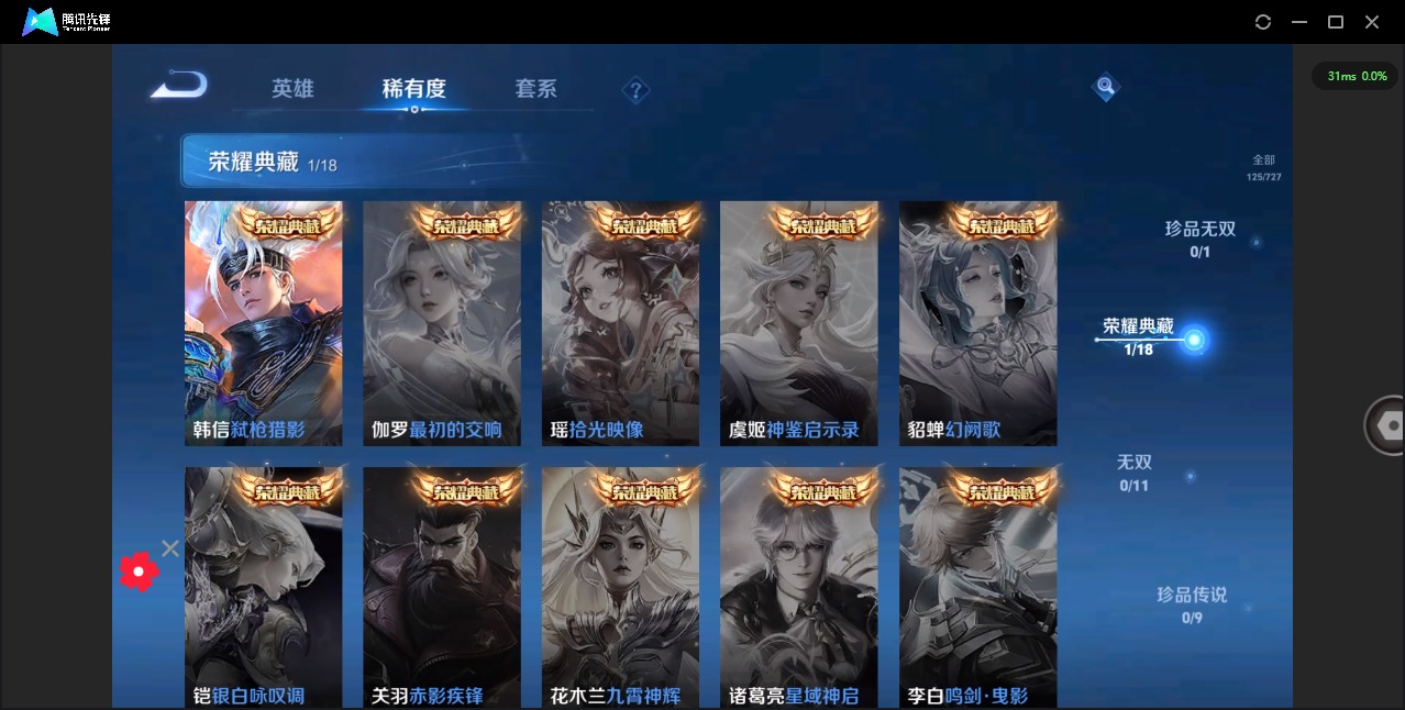 - [11522279]V7 1典藏 5传说 124英雄 252皮肤 可修改实名 荣耀水晶:最初的交响(伽罗典藏) 传说皮:地狱火,仲夏夜之梦(大飞蛾),云霓雀翎 珍宝阁皮:优雅恋人,蔷薇恋人 限定皮:白虎志(电光耗子),时雨天司(水龙头),遇见飞天,五谷丰年,青龙志(铠年限),冰锋战神,梁祝,逐梦之星,天狼溯光者,李小龙,逐梦之影,一生所爱,大圣娶亲,冰霜恋舞曲,乒乒小将 史诗皮:茶境仙,蔬乡物语(鲁班七号),紫霞仙子,苍穹之光,电玩小子(小书包),特工魅影,千年之狐,江河有灵,偶像歌手,电玩·爆裂旋风,猫狗日记-孙策,乱世虎臣,节奏热浪,女仆咖啡,摇滚巨星,水果甜心,天才门将,星夜王子,心灵骇客,功夫厨神,暗隐猎兽者,鬼剑武藏,心灵战警,舞动绿茵,纤云弄巧,繁星吟游(呼啦呼啦),拒霜思,乘风破浪,逐浪之夏,月团寄思,水晶猎龙者,金属风暴,圣诞狂欢,圣诞恋歌,鹰眼统帅,魅力维加斯,无心,未来纪元-赵云