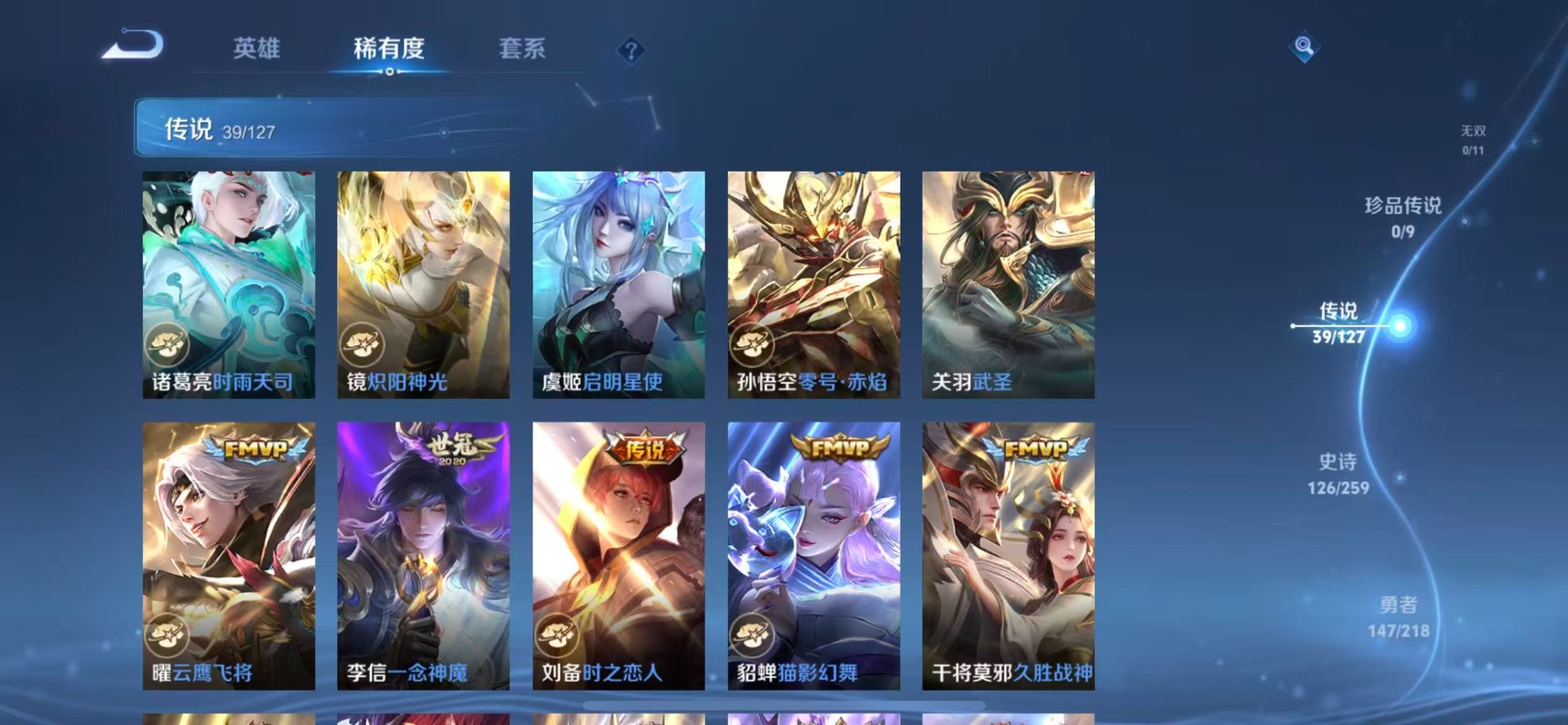- PX_2097222-42 安卓QQ/至尊星耀/213皮肤/123英雄/1典藏/0珍品无双/0无双/0珍品传说/2传说/58史诗/7稀有英雄 【1 典藏皮肤】鸣剑·曳影 李白, 【2 传说皮肤】无双飞将 马超,仲夏夜之梦 貂蝉, 【58 史诗皮肤】末日机甲 吕布,白昼王子 嬴政,逐梦之星 马可波罗,紫霞仙子 露娜,银河之约 李元芳,狮舞东方 鲁班七号,德古拉伯爵 刘邦,心灵战警 亚瑟,五谷丰年 鬼