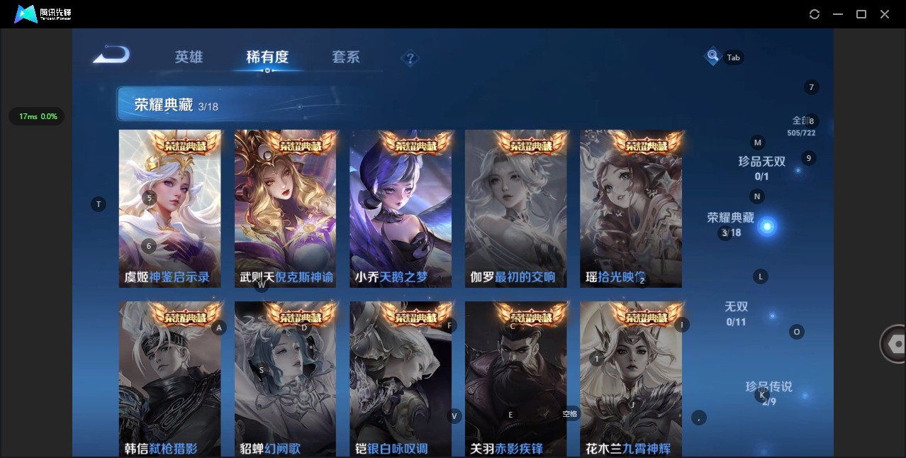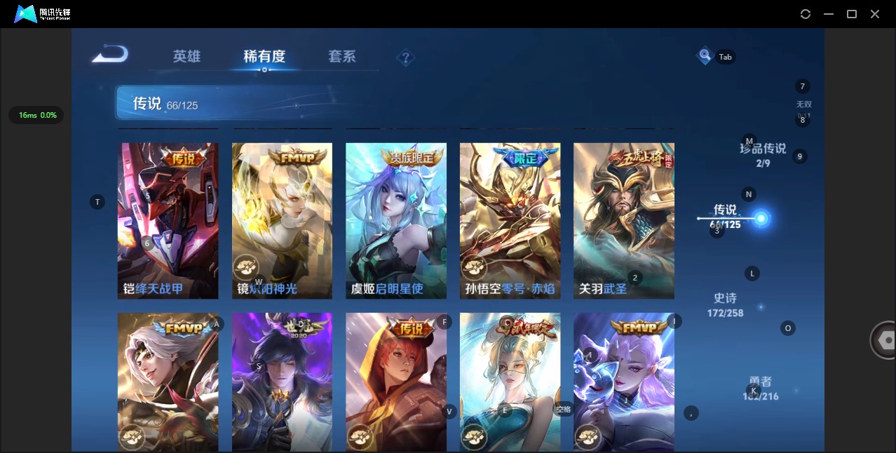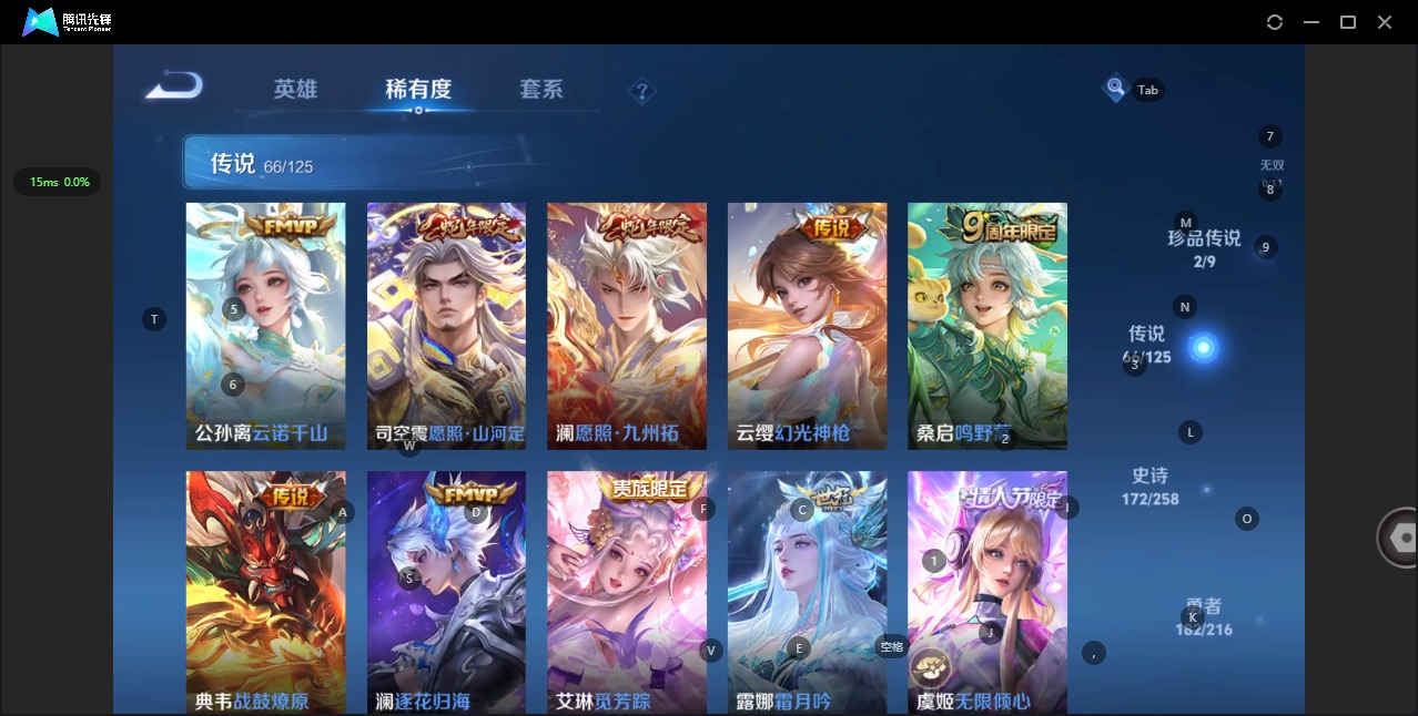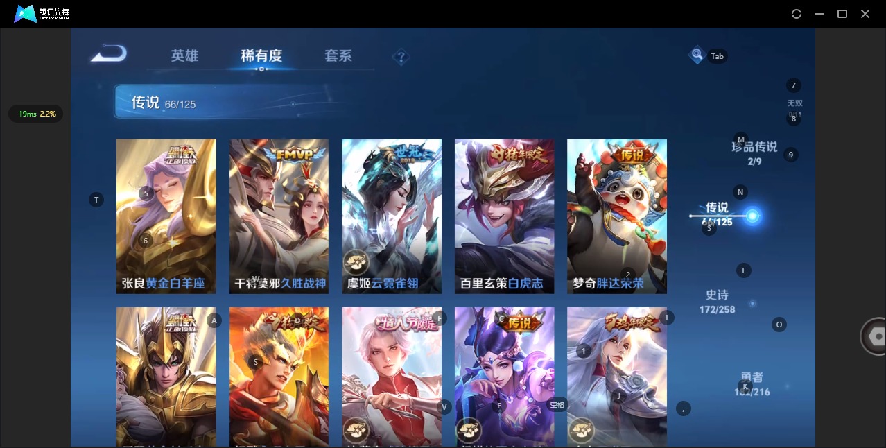 - PX_2096219-82 安卓QQ/永恒钻石/309皮肤/124英雄/5典藏/0珍品无双/1无双/3珍品传说/18传说/89史诗/9稀有英雄 【3 珍品传说】怪盗基德 马可波罗,器灵·落星盏 嫦娥,江户川柯南 鲁班七号, 【5 典藏皮肤】鸣剑·曳影 李白,全息碎影 孙悟空,杀手不太冷 孙尚香,弑枪猎影 韩信,无限飓风号 夏侯惇, 【1 无双皮肤】碎月剑心 李白, 【18 传说皮肤】武圣 关羽,启
