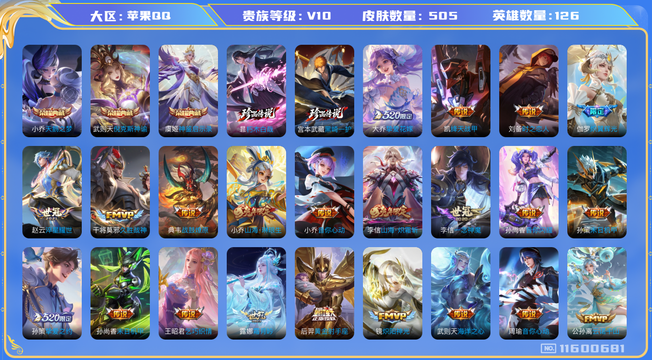 [11600681]V10 3典藏 2珍品传说 66传说 126英雄 505皮肤 典藏英雄武则天 可修改实名 荣耀水晶:神鉴启示录,天鹅之梦(小乔典藏),倪克斯神谕(宇宙婆娘) 珍品传说:朽木白哉,黑崎一护 传说皮:典韦战鼓燎原,云诺千山,幻光神枪,游龙清影(小青龙),山海·炽霜斩(李信年限),山海·琳琅生(小乔年限),黄金射手座,黄金白羊座,零号·赤焰,地狱火,仲夏夜之梦(大飞蛾),海洋之心,地狱之眼,末日机甲-孙尚香(绿蚂蚱),云霓雀翎,一念神魔,淬星耀世,久胜战神,猫影幻舞,云鹰飞将(小将军),炽阳神光,无双飞将,音你心动-小乔,音你心动-周瑜,胖达荣荣,乞巧织情,时之恋人-刘备(电焊工),飞鸢探春,绛天战甲(鸡嘴战神),超时空战士-狄仁杰,末日机甲-孙策,挚爱之约,挚爱花嫁,音你闪耀(rap皮),碎云,神器·狴犴令,山海·苍雷引(电光曜子),炽翼辉光(娃娃菜牛角包),霜月吟,澜逐花归海,艾琳觅芳踪 珍宝阁皮:优雅恋人,蔷薇恋人,女武神 限定皮:愿照·九州拓(澜年限),愿照·山河定(司空震年限),逐霄战戟,鸣野蒿,至尊宝,白虎志(电光耗子),凤求凰(白切鸡),凤凰于飞,太华(伽罗年限),武陵仙君(小桃花),异界灵契(白毛香),傲雪梅枪,补天,寅虎·展翼(孙膑年限),星穹之声,绯月行,时之彼端,白鹤梁神女,白晶晶,时雨天司(水龙头),神威(电光马子),飞衡(韩信年限),玄嵩(庄周年限),山海·碧波行(瑶年限),瑞麟志(木兰年限),遇见飞天,高山流水,诗剑行,无限倾心-虞姬,匿光决锋者,怒海麟威,降魔,五谷丰年,青龙志(铠年限),冰锋战神,幽恒(沐浴露),武圣,天狼运算者,梁祝,御风骁将(吕布年限),天狼狩猎者,龙胆,逐梦之星,烈魂,岱宗(典韦年限),天狼溯光者,天狼征服者,奔雷神使(牛魔年限),祈雪灵祝(雪兔子),天狼绘梦者,李小龙,逐梦之光,玄武志(苏烈年限),朱雀志(守约年限),永曜之星,辉光之辰,如梦令-嫦娥,如梦令-后羿,奇迹圣诞,默契交锋-兰陵王,默契交锋-花木兰,孙行者,大圣娶亲,天魔缭乱,青春决赛季,冰霜恋舞曲,乒乒小将,蜜橘之夏,神奇女侠,匿光追影者,女儿国国王,寅虎·御盾(廉颇年限),寅虎·瑞焰(虎皮蛋子),寅虎·心曲(虎婆),寅虎·赤拳(老虎年限),时之祈愿-云中君,时之祈愿-瑶(瑶传限),玉兔公主,唐三藏,枫霜尽,时之奇旅-妲己,神器·万象笔,梦圆繁星,山海·