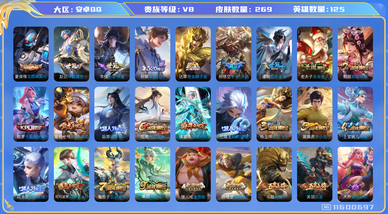 [11600697]V8 1典藏 12传说 125英雄 269皮肤 可修改实名 优质装备:无限飓风号(高达),黄金狮子座,一念神魔,云霓雀翎,零号·赤焰,淬星耀世,挚爱之约 珍宝阁皮:蔷薇恋人,女武神 限定皮:鸣野蒿,时雨天司(水龙头),神威(电光马子),遇见飞天,高山流水,五谷丰年,武圣,游园惊梦,梁祝,天狼溯光者,李小龙,如梦令-后羿,圣诞老人,默契交锋-兰陵王,默契交锋-花木兰,孙行者,猪悟能,寅虎·瑞焰(虎皮蛋子),山海·玄木吟(马可年限) 史诗皮:百相守梦-百里守约,苍穹之光,电玩小子(小书包),黄金分割率,千年之狐,永昼,江河有灵,偶像歌手,龙骑士(小龙虾),暗夜猫娘,无限星赏官,冰冠公主,末日机甲-吕布,猫狗日记-孙策,猫狗日记-大乔,乱世虎臣,节奏热浪,修罗,女仆咖啡,摇滚巨星,水果甜心,绅士熊喵,天才门将,星夜王子,心灵骇客,时之奇旅-安琪拉,功夫厨神,德古拉伯爵,暗隐猎兽者,幽灵船长,鬼剑武藏,暗渊魔法,心灵战警,天秀·启明,舞动绿茵,地狱岩魂,纤云弄巧,繁星吟游(呼啦呼啦),拒霜思,缤纷独角兽,乘风破浪,逐浪之夏,月团寄思,水晶猎龙者,金属风暴,原初追逐者,圣诞狂欢,圣诞恋歌,鹰眼统帅,魅力维加斯,黎明之约,未来纪元-赵云