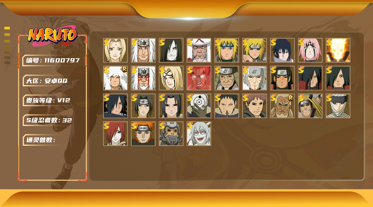[11600797]V12 32S忍 37A忍 1566.4W战力 可二次 可修改实名 S级忍者:宇智波佐助「永恒万花筒」,春野樱 「忍界大战」,漩涡鸣人 「九喇嘛连结」,迈特凯「死门」,宇智波斑 「木叶创立」,宇智波带土 「忍界大战」,千手柱间「秽土转生」,罗砂「四代目风影」,自来也 「舞之豪杰」,宇智波鼬「秽土转生」,药师兜「仙人模式」,宇智波斑「秽土转生」,艾「三代目雷影」,“宇智波斑” 「白面具」,半藏「秽土转生」,千手扉间「秽土转生」,纲手「百豪」,波风水门「秽土转生」,无「二代目土影」,金角/银角「秽土转生」,猿飞日斩「秽土转生」,长门「秽土转生」,宇智波斑,自来也「仙人模式」,宇智波鼬 「须佐能乎」,佩恩「天道」,猿飞日斩,波风水门,大蛇丸,自来也,纲手
