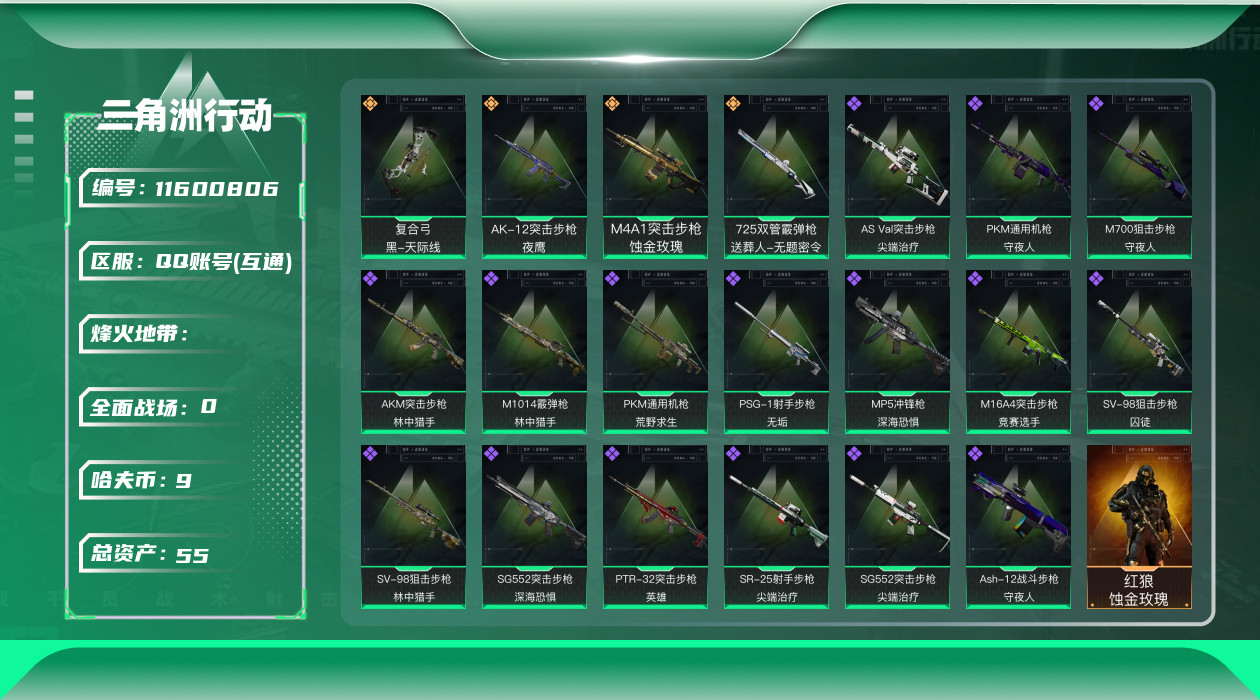 [11600806]可二次 可修改实名 实名:可修改 顶级安全箱(3×3)9.15号到期 总资产:55.4 哈夫币:9.055 传说武器皮肤:AK-12突击步枪-夜鹰,复合弓-黑-天际线,725双管霰弹枪-送葬人-无题密令,M4A1突击步枪-蚀金玫瑰 史诗武器皮肤:SR-25射手步枪-尖端治疗,PKM通用机枪-荒野求生,AS Val突击步枪-尖端治疗,M700狙击步枪-守夜人,SG552突击步枪-尖端治疗,Ash-12战斗步枪-守夜人,MP5冲锋枪-深海恐惧,SG552突击步枪-深海恐惧,AKM突击步枪-林中猎手,M16A4突击步枪-竞赛选手,PKM通用机枪-守夜人,M1014霰弹枪-林中猎手,SV-98狙击步枪-林中猎手,PTR-32突击步枪-英雄,PSG-1射手步枪-无垢,SV-98狙击步枪-囚徒 干员外观:红狼-蚀金玫瑰,无名-夜鹰,露娜-黑·天际线
